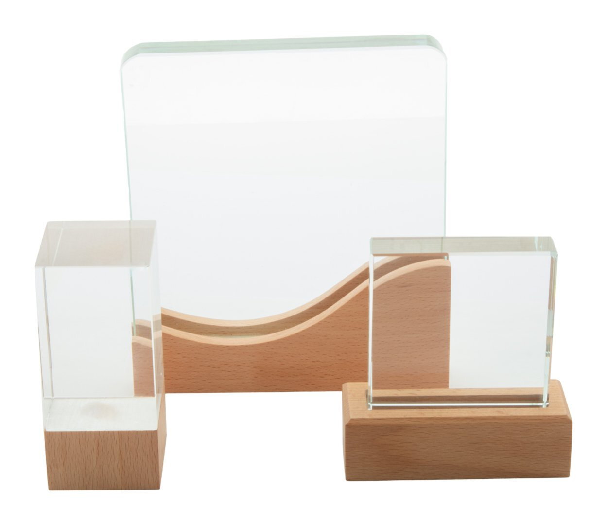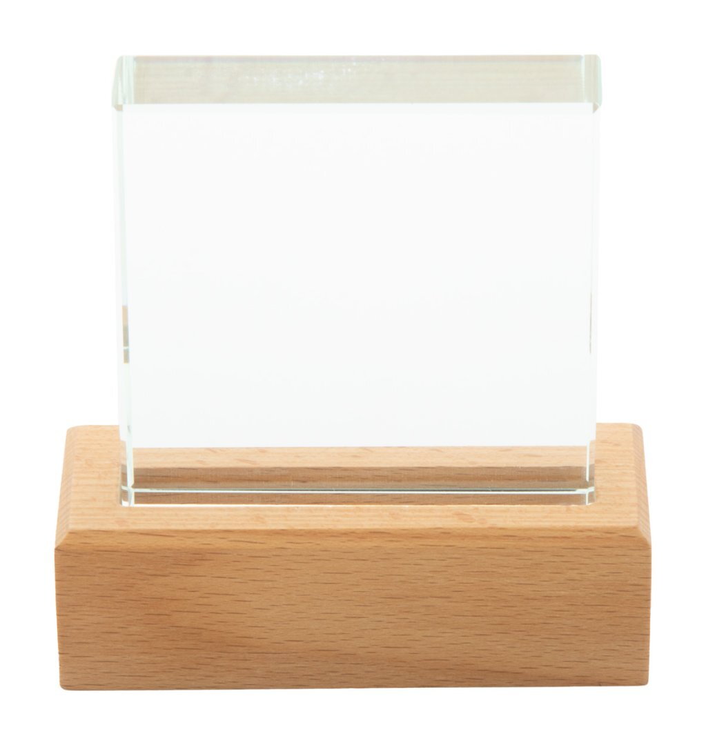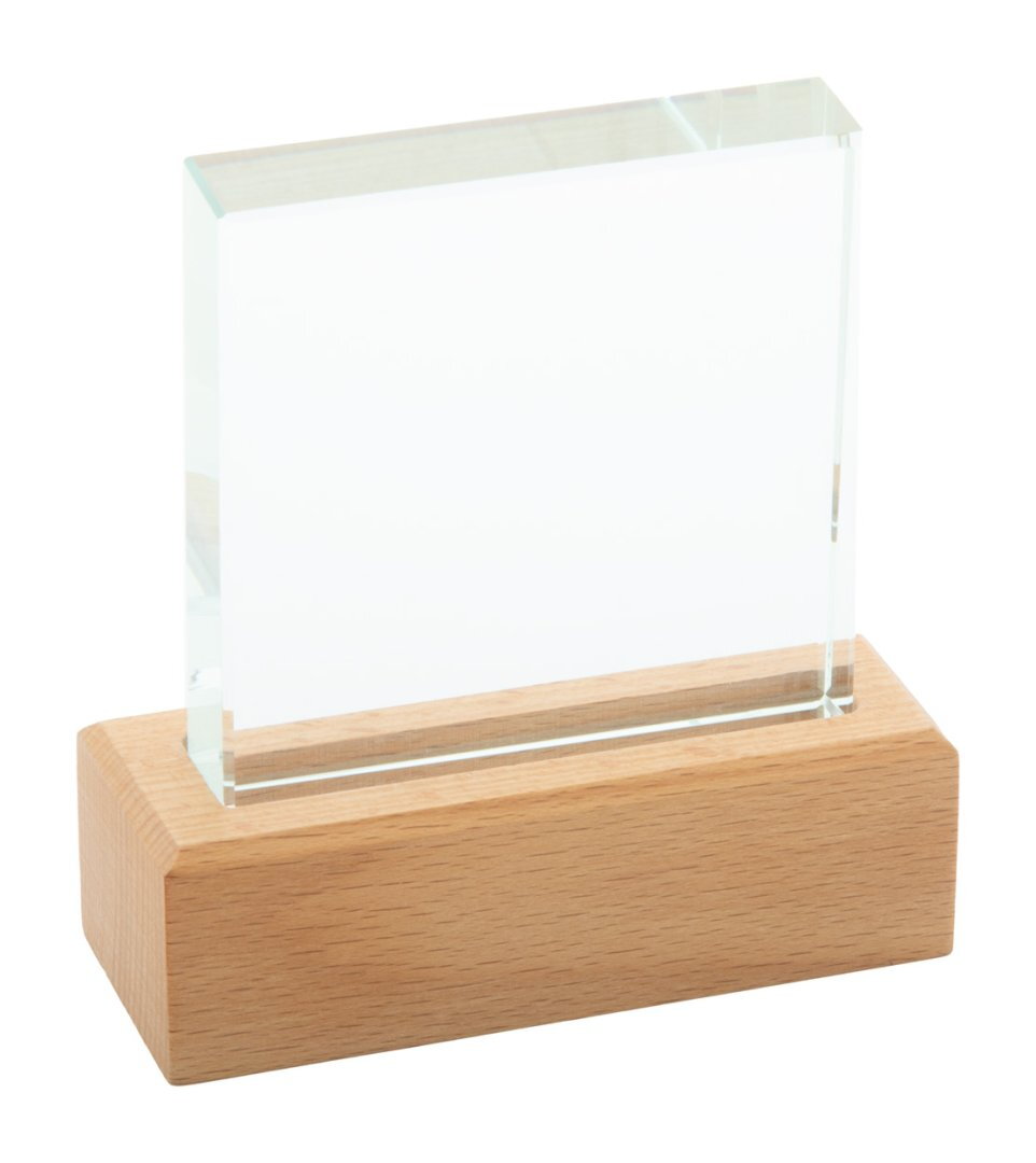 Üvegtrófea bükkfa alappal, kraft papír ajándékdobozban.