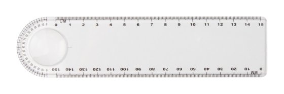 15 cm-es műanyag vonalzó nagyítóval és fokmérővel (cm és mm skálával).