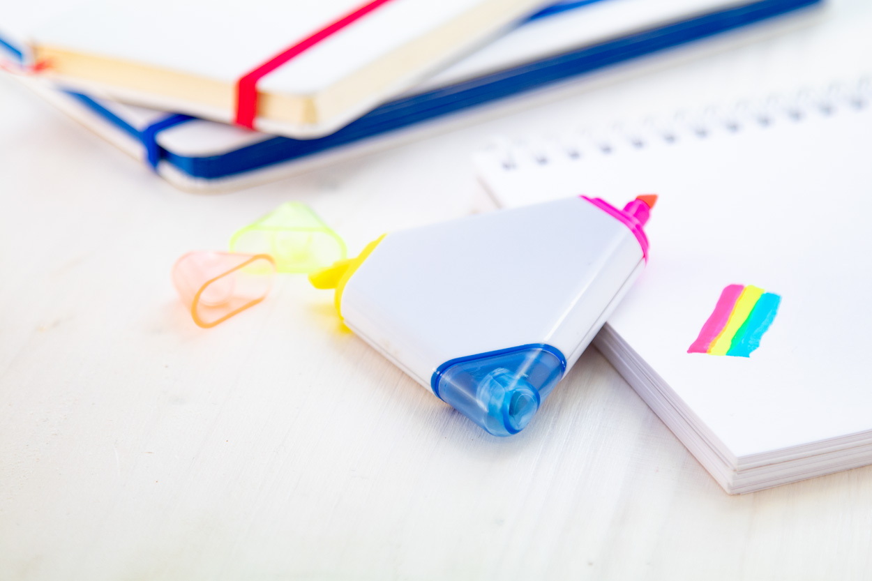 Háromszög alakú szövegkiemelő, három különböző színnel, áttetsző kupakokkal.