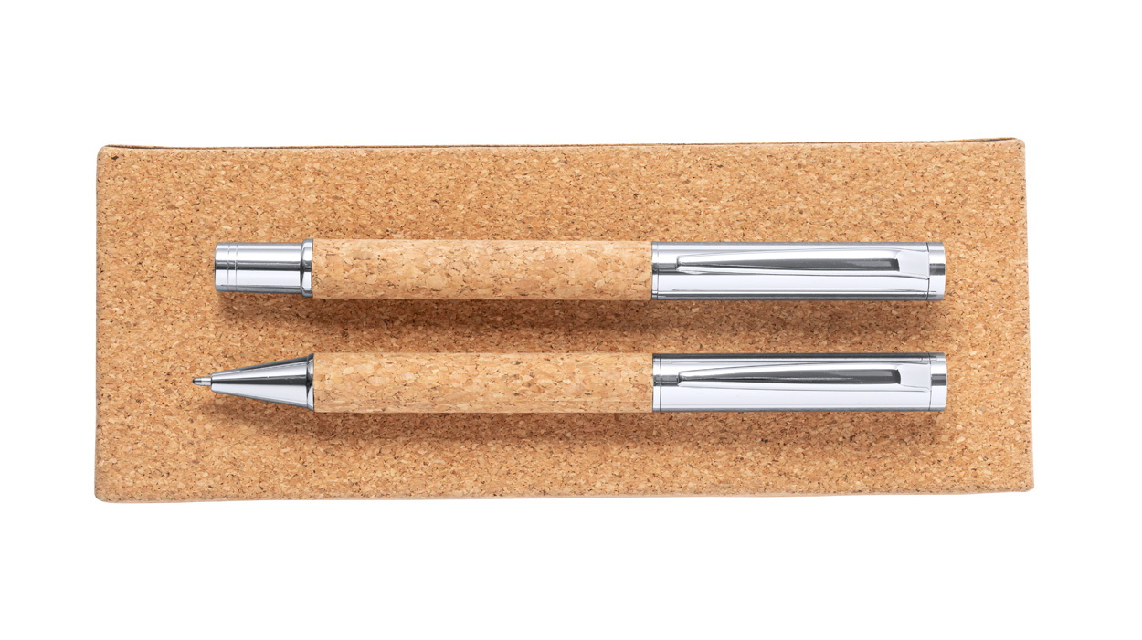 Elegáns, fém golyóstoll és rollertoll szett természetes parafa borítással. Parafa dobozban, kék tollbetéttel szállítjuk.