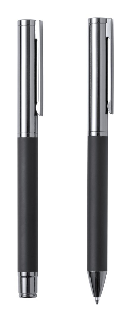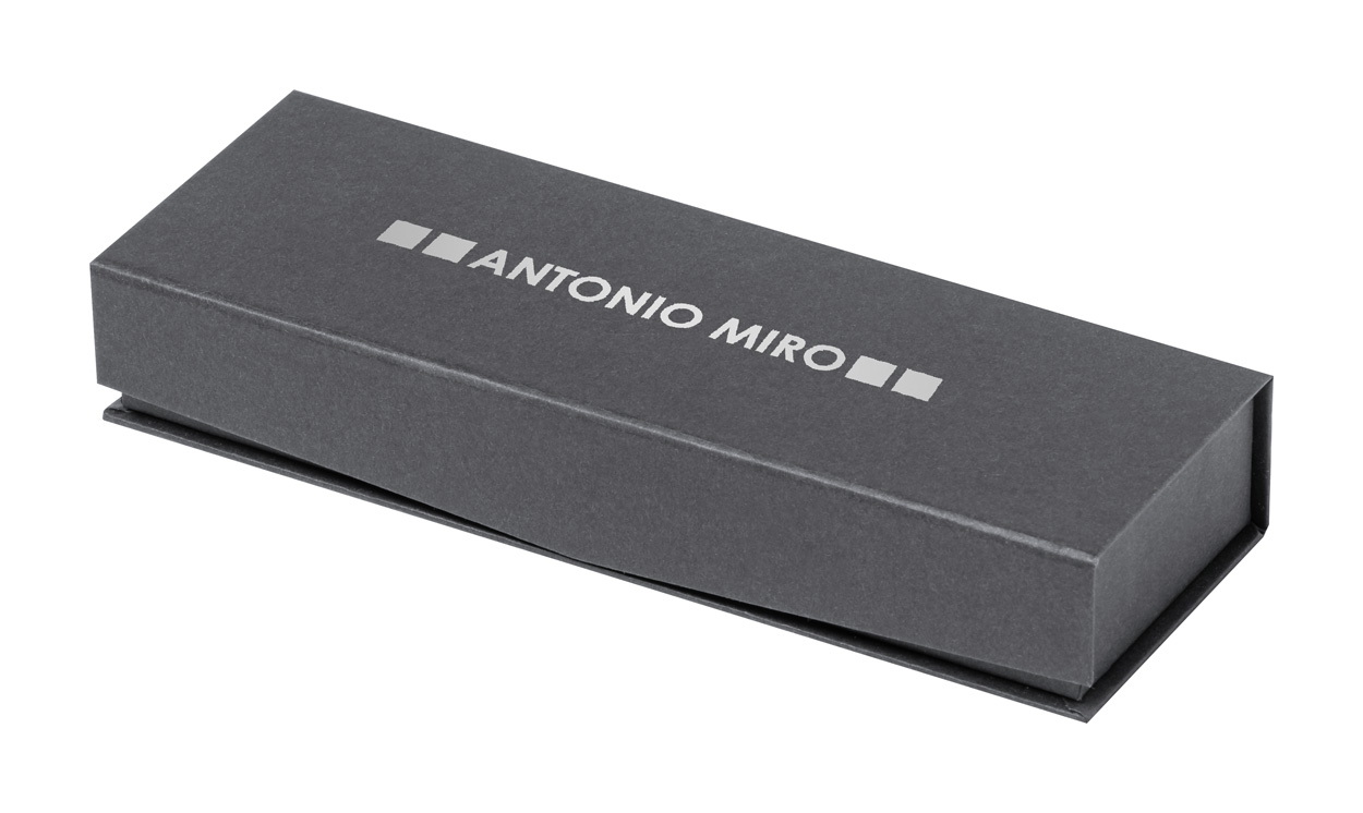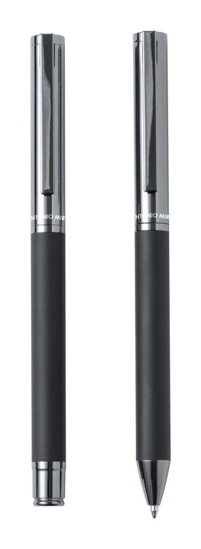 Elegáns fém golyóstoll és rollertoll matt felülettel. Fekete díszdobozban, kék tollbetéttel szállítjuk. Antonio Miro márkatermék.