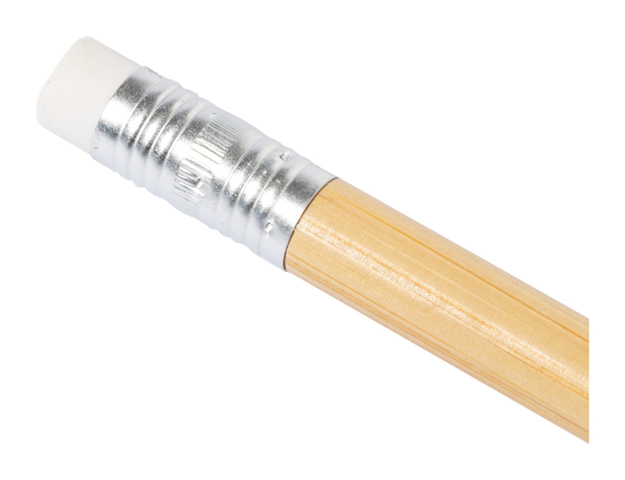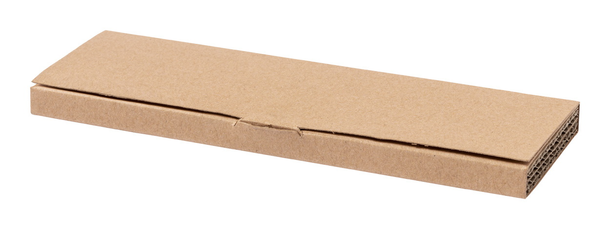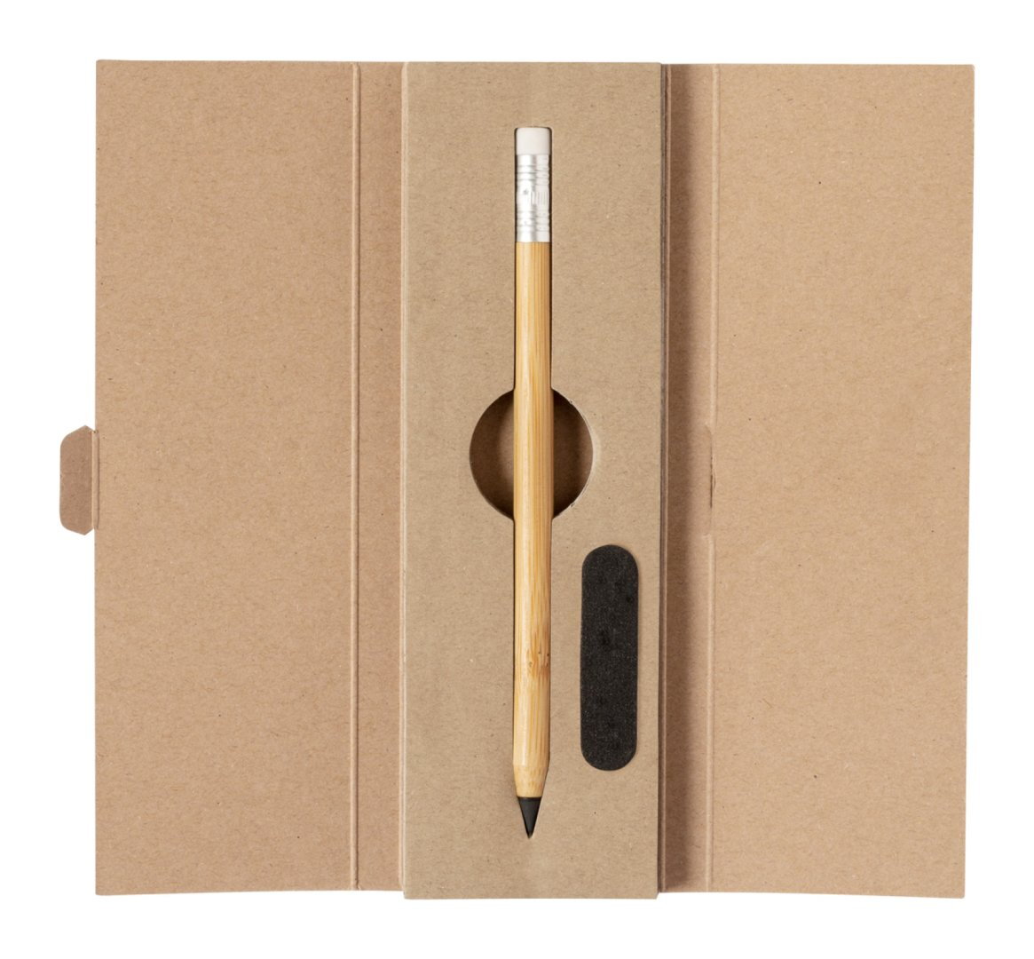 Hosszan tartó tintamentes bambusztoll radírral és fém heggyel, amely oxidálja a papírt. Ez a toll egy ceruzához hasonlóan ír és radírozható. Újrahasznosított kartondobozban, hegyezővel.