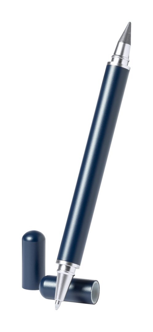 Többfunkciós fém toll. Egyik oldalán golyóstollal, kék tollbetéttel, másik oldalán tintamentes tollal és fémötvözet heggyel, amely oxidálja a papírt. Ez a toll a ceruzához hasonlóan ír, és radírozható is. Kupakkal ellátva.