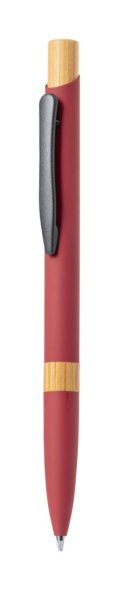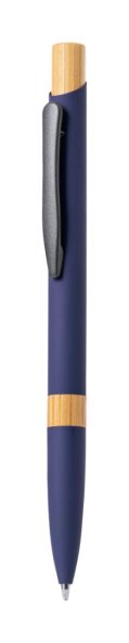 Alumínium golyóstoll bambusz részletekkel, fém klipsszel, gumírozott felülettel és kék tollbetéttel.