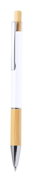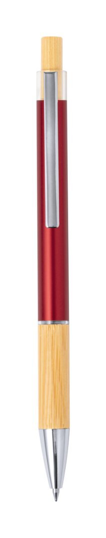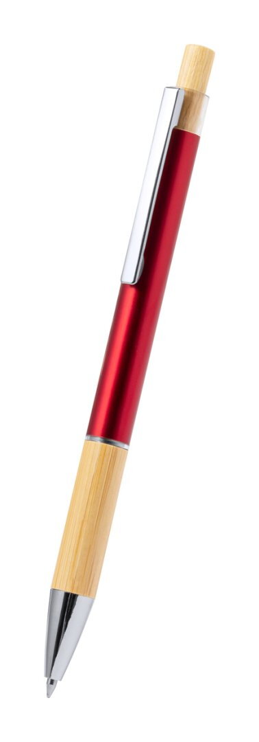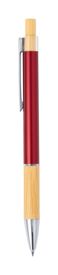 Alumínium golyóstoll bambusz gombbal és markolattal, fém részletekkel és kék tollbetéttel.