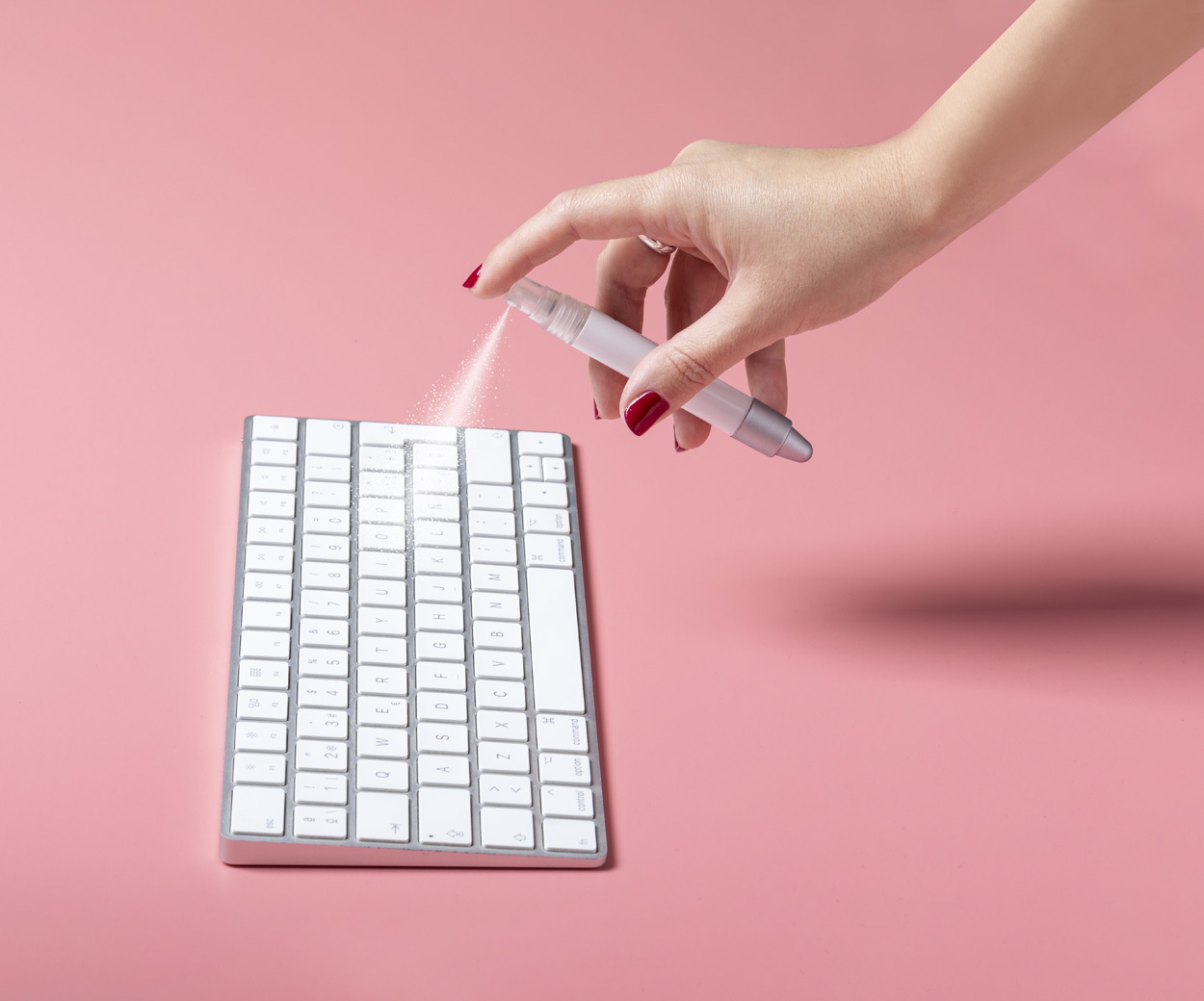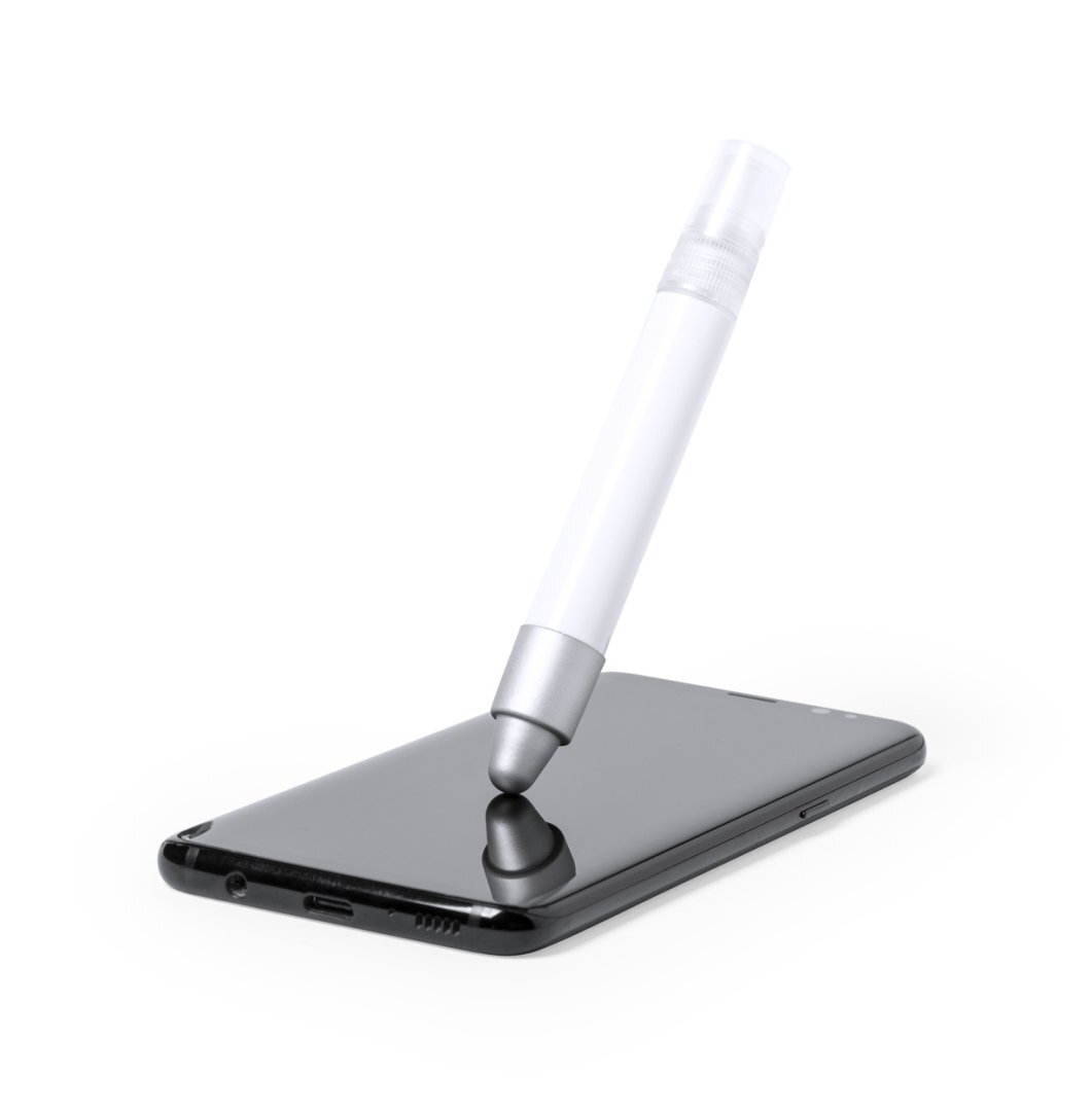 Antibakteriális műanyag golyóstoll érintőképernyős véggel és kéztisztító spray-vel a tetején. Kék tollbetéttel szállítjuk. Kapacitás: 3 ml. Kék tollbetéttel és tisztító folyadék nélkül szállítjuk. Megfelelt az ISO 22196 előírásainak.