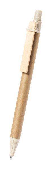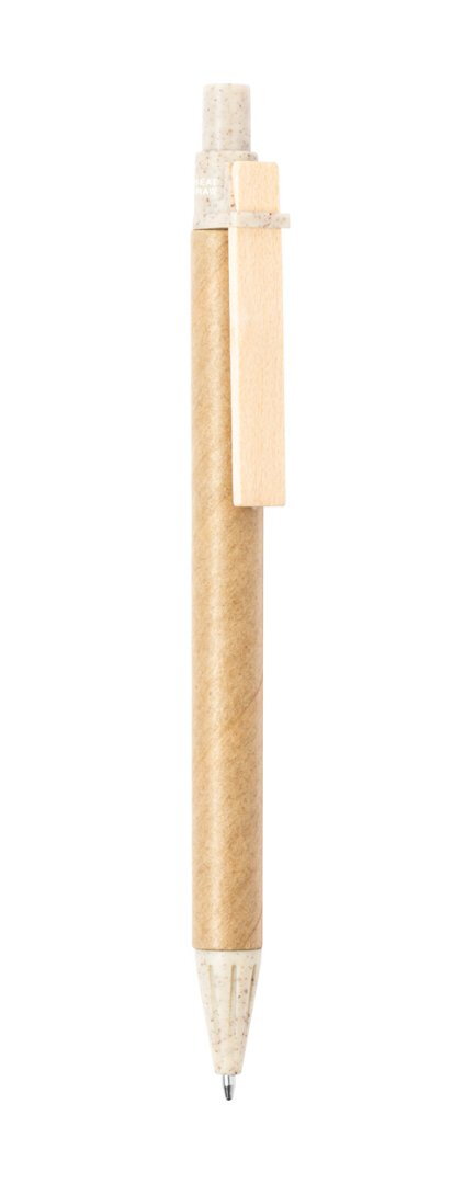 Újrahasznosított papír golyóstoll búzaszalma műanyag részekkel és fa klipsszel. Kék utántöltővel.