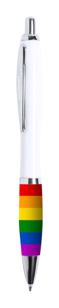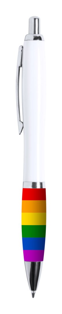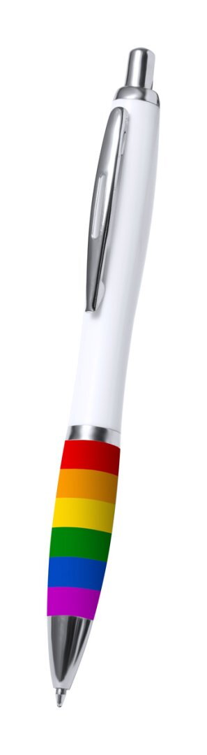 Golyóstoll szivárványszínű markolattal, fehér testtel és fém klipsszel. Kék tollbetéttel szállítjuk.