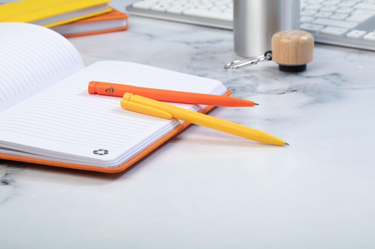 Újrahasznosított ABS műanyag golyóstoll kék tollbetéttel.