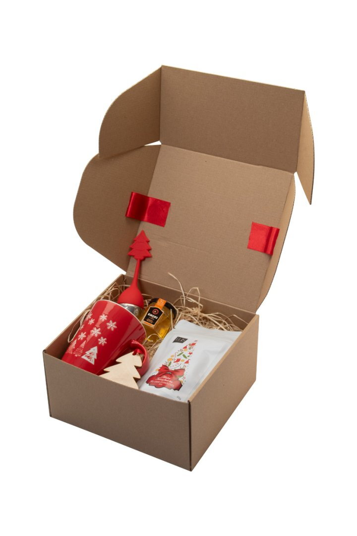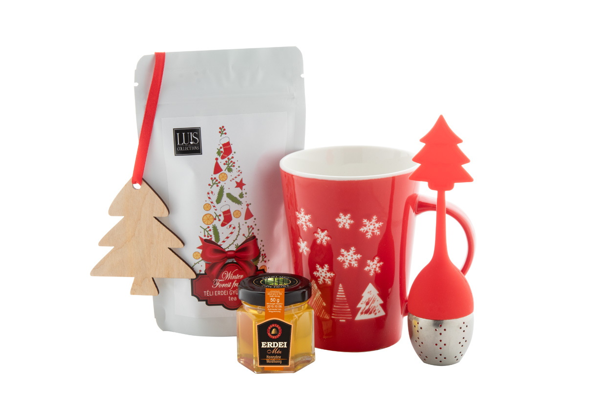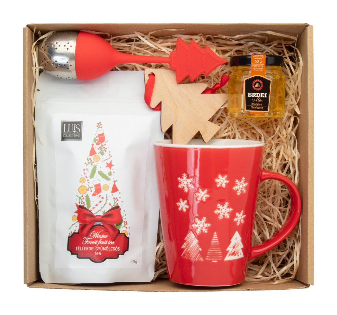 Teás ajándékcsomag kraft karton dobozban, fából készült gyapjútöltelékkel és piros szalaggal. "Perala" karácsonyi bögrét; "Luis" téli erdei gyümölcsteát (30 g); "Always Gourmet" erdei mézet (50 g); "Strobus" teafőzőt; "WoXmas" karácsonyfadíszt tartalmaz.