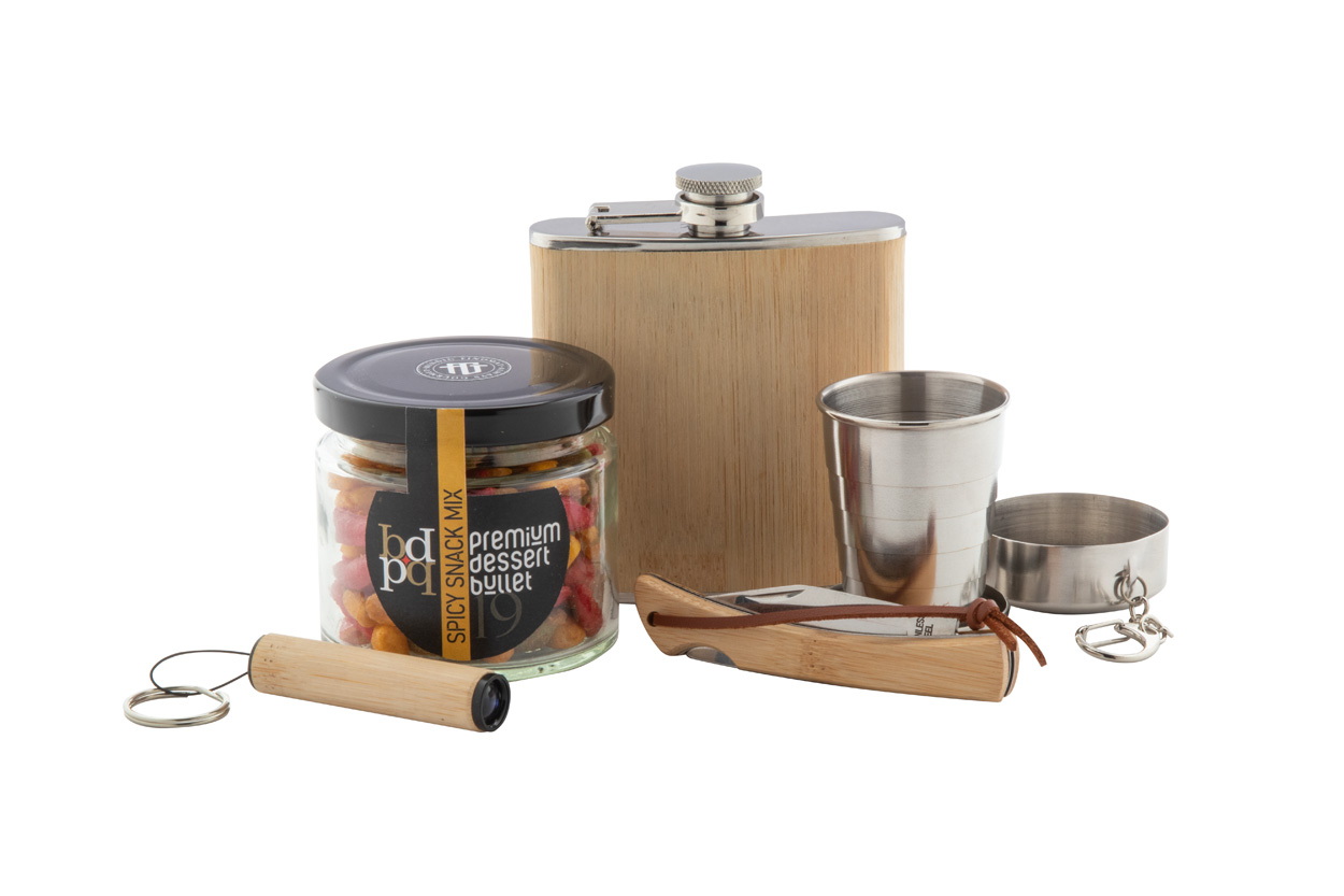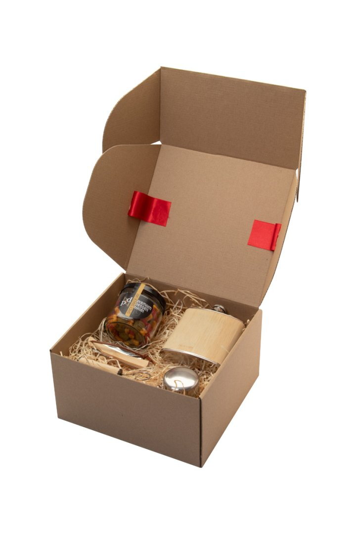 Italos ajándékcsomag kraft karton dobozban, fából készült gyapjútöltelékkel és piros szalaggal. "Borester" flaskát; "Nautilus" összecsukható poharat; "Premium Dessert Bullet" snack mixet (80 g); "Sultan" zsebkést; "Lampoo" bambusz zseblámpát tartalmaz.