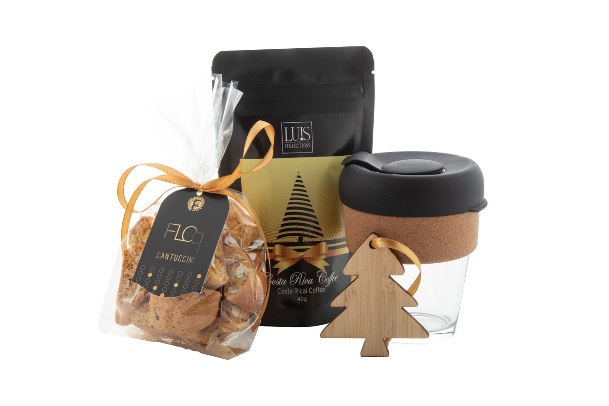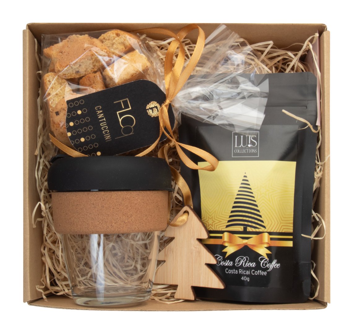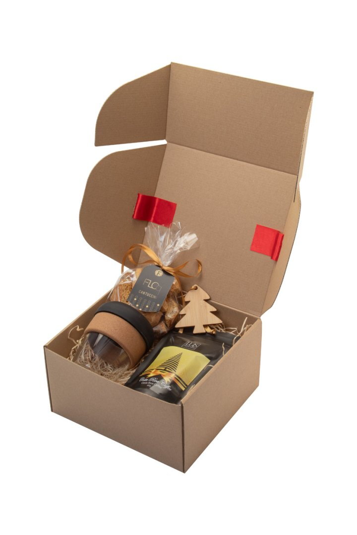 Kávés ajándékcsomag kraft karton dobozban, fából készült gyapjútöltelékkel és piros szalaggal. "Tarkol" üveg utazóbögrét; "Luis" Costa Rica kávét (40 g); "Floq" kézműves cantuccinit (100 g); "Holonda" karácsonyfadíszt tartalmaz.