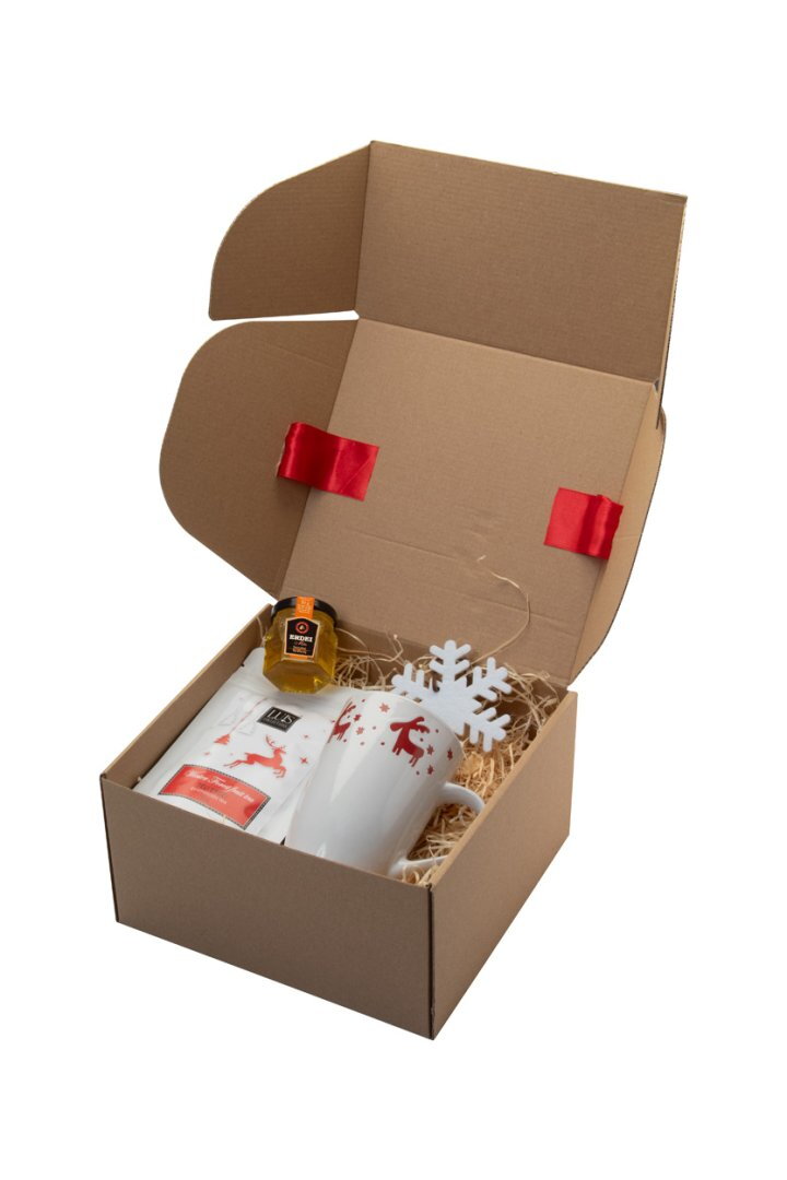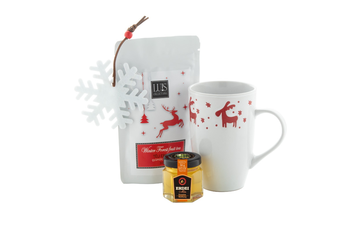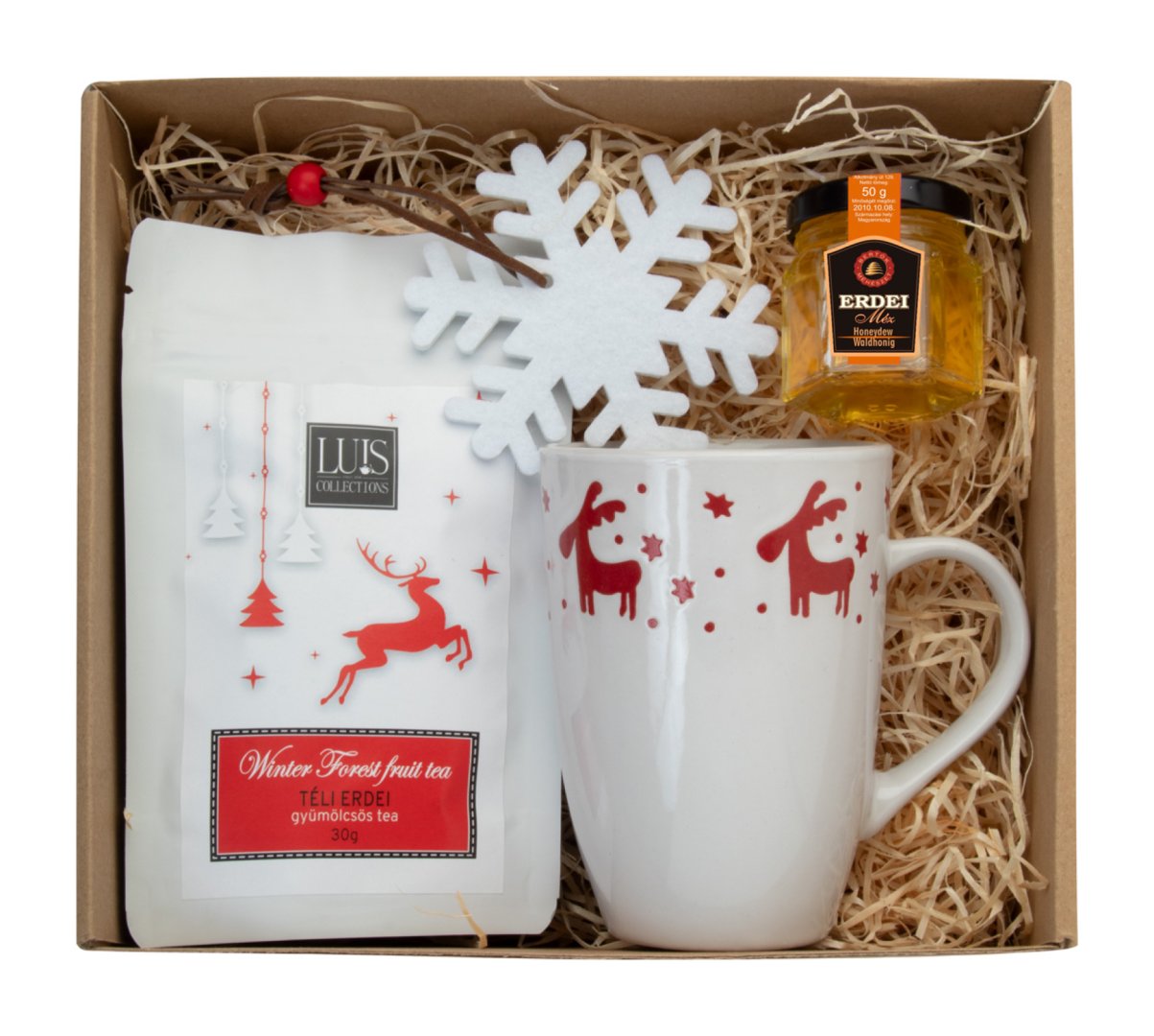 Teás ajándékcsomag kraft karton dobozban, fából készült gyapjútöltelékkel és piros szalaggal. "Lempaa" karácsonyi bögrét; "Luis" téli erdei gyümölcsteát (30 g); "Always Gourmet" erdei mézet (50 g); "Fantasy" karácsonyfadíszt tartalmaz.