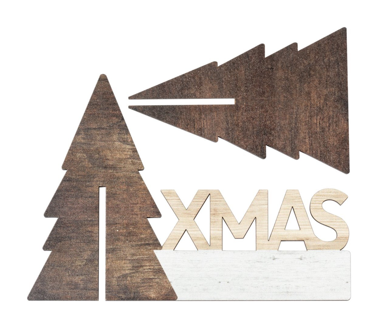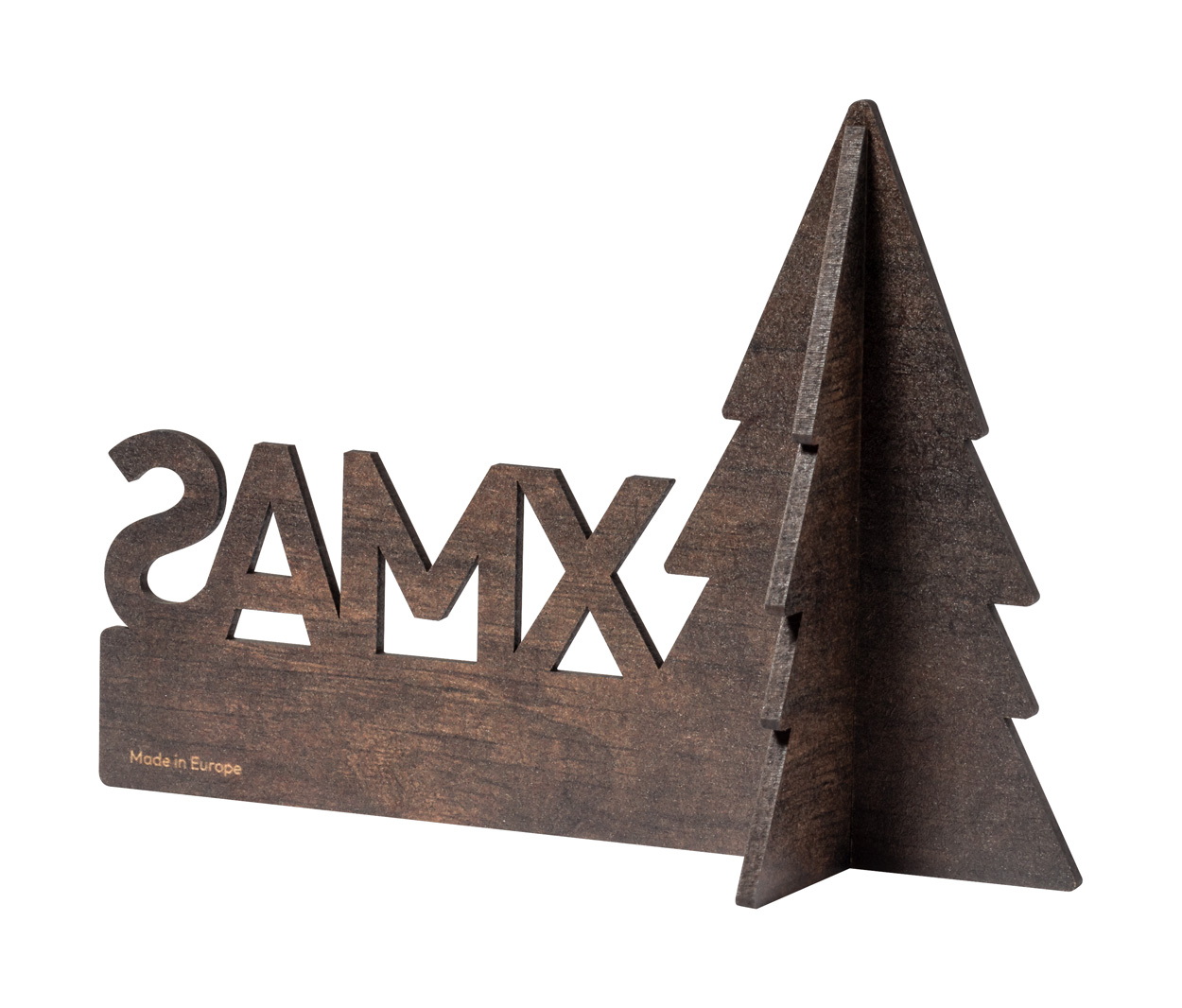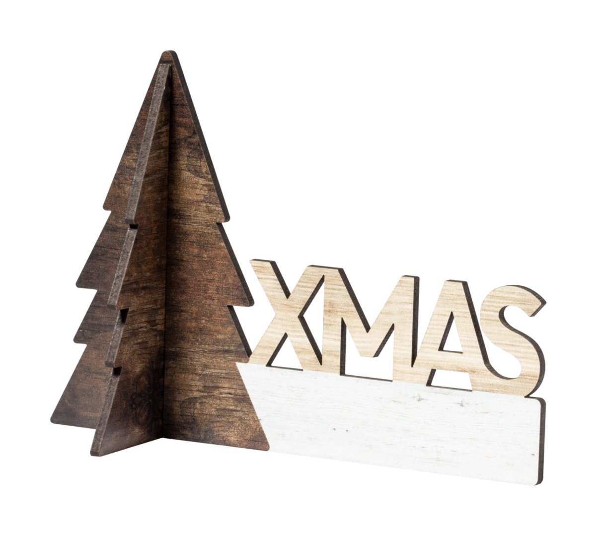 Fa karácsonyi asztaldísz kivágott szöveggel, karácsonyfa motívummal, kéttónusú kivitelben. Lapra szerelve szállítjuk.