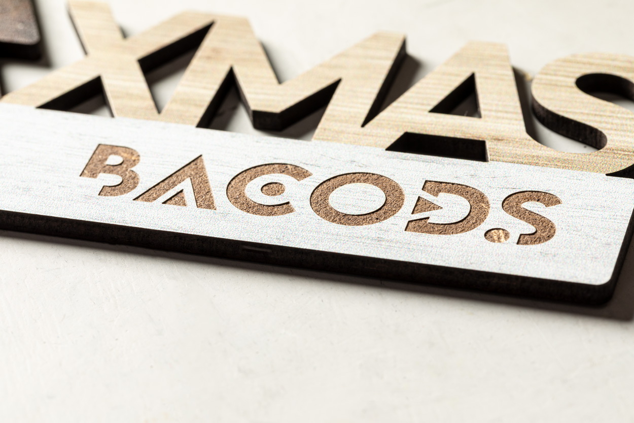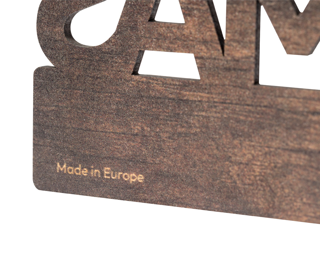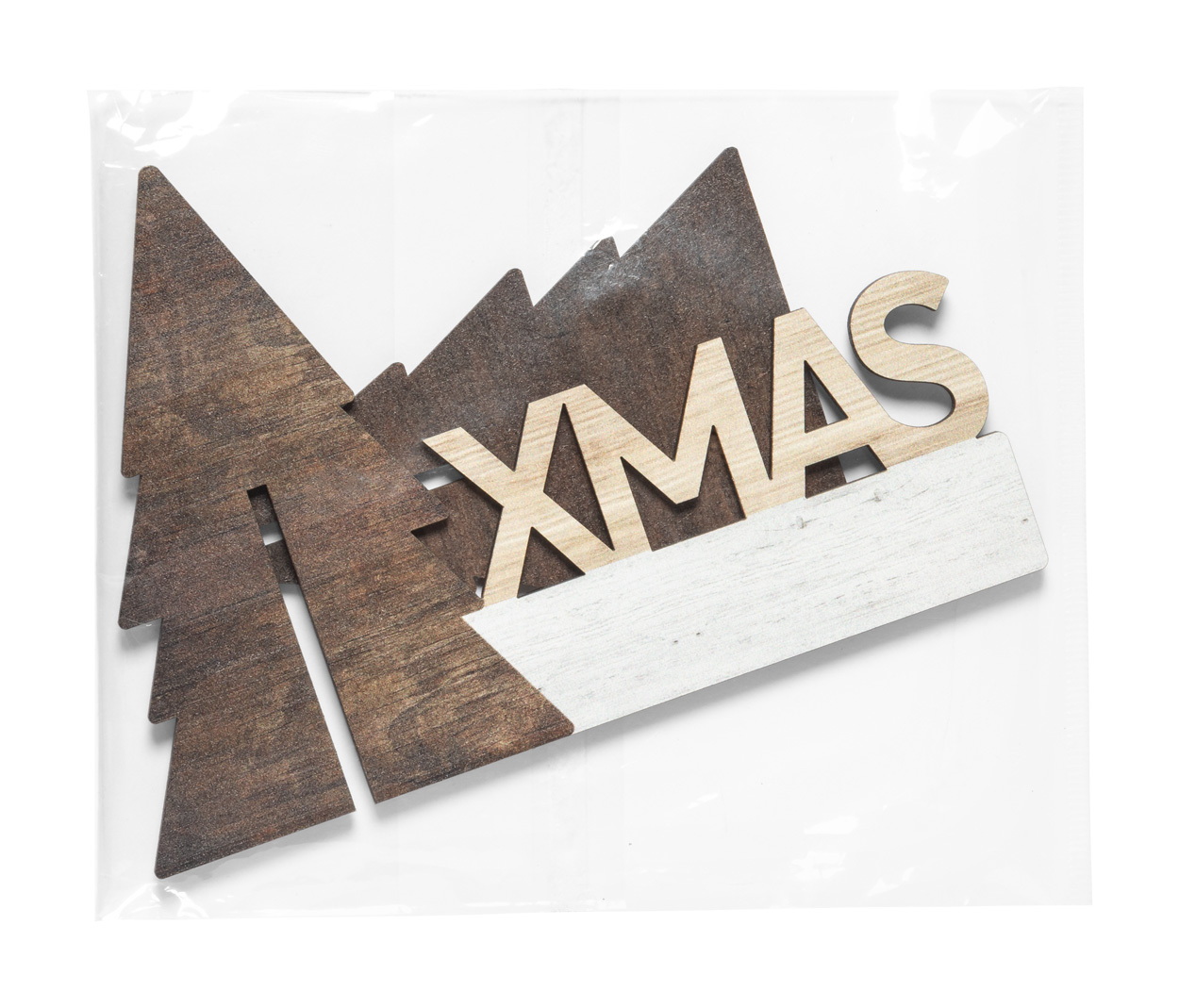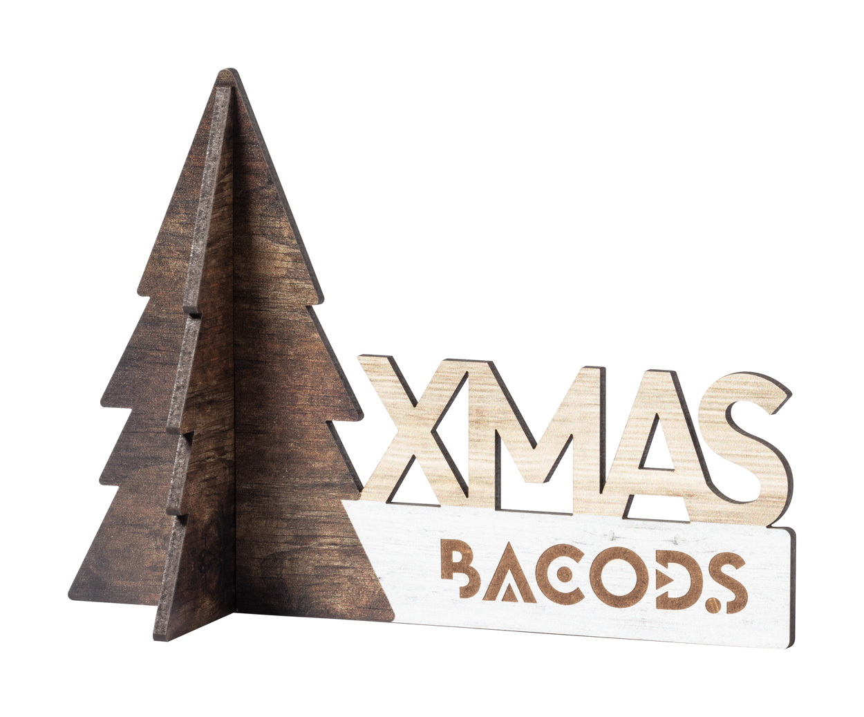Fa karácsonyi asztaldísz kivágott szöveggel, karácsonyfa motívummal, kéttónusú kivitelben. Lapra szerelve szállítjuk.
