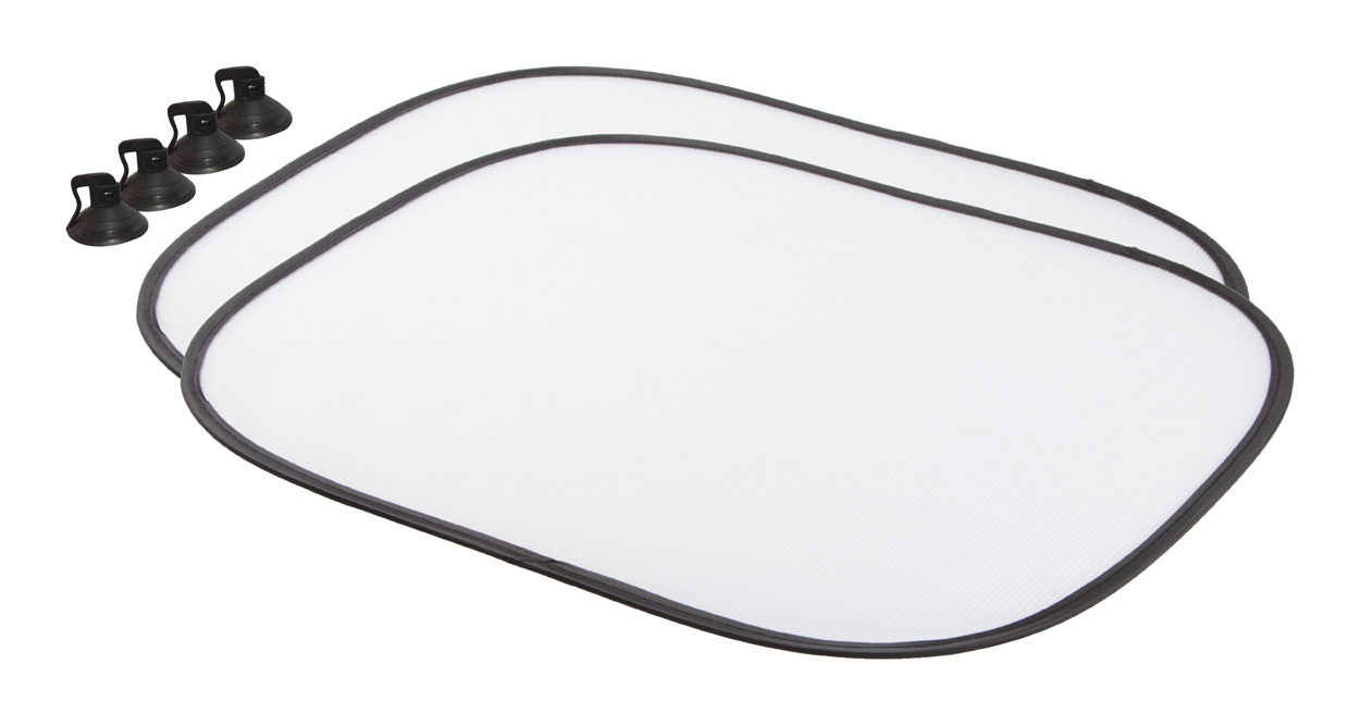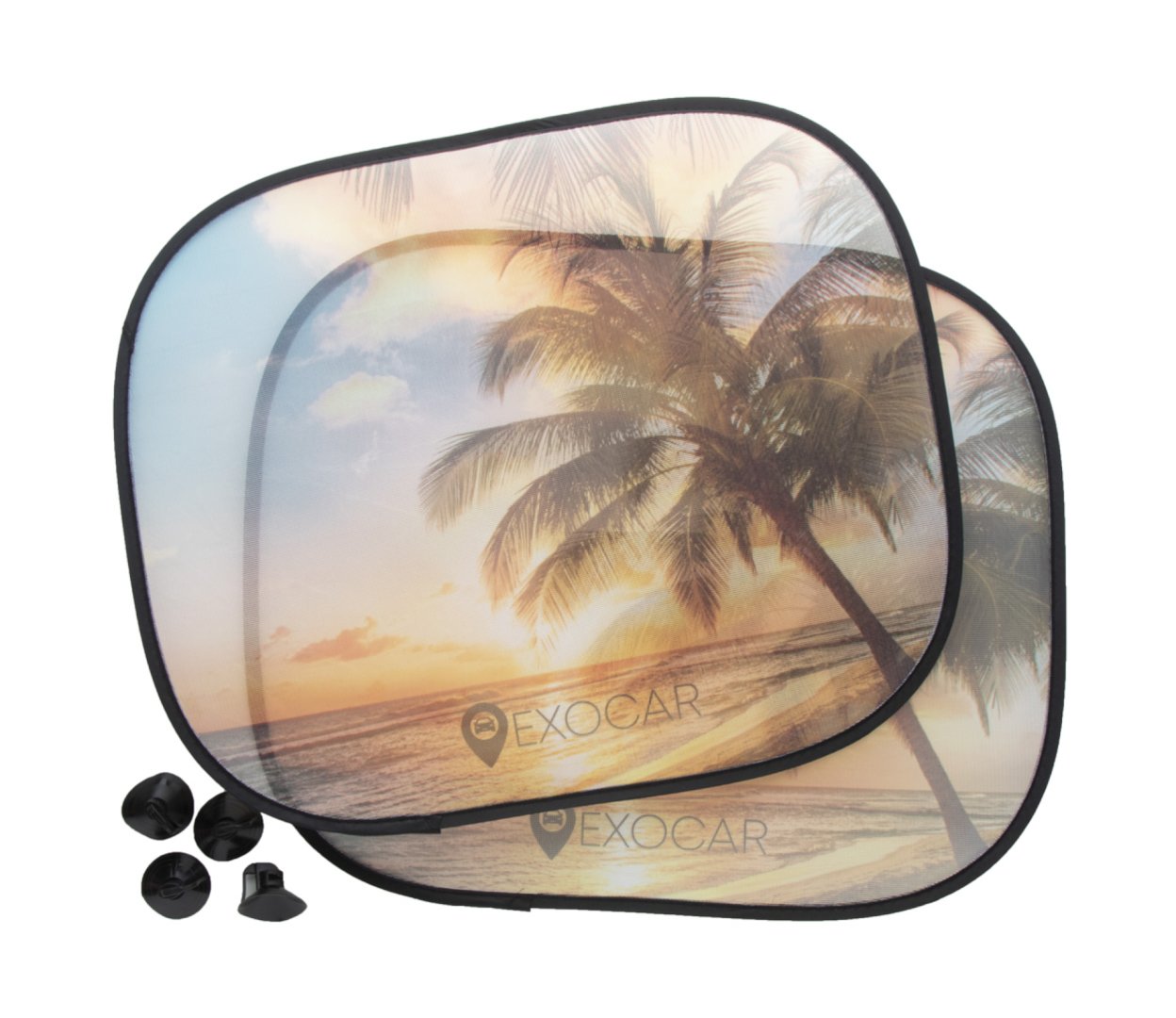 Összehajtható, 2 db-os szublimációs autós napellenző szett, oldalsó ablakokhoz, 2-2 tapadókoronggal.