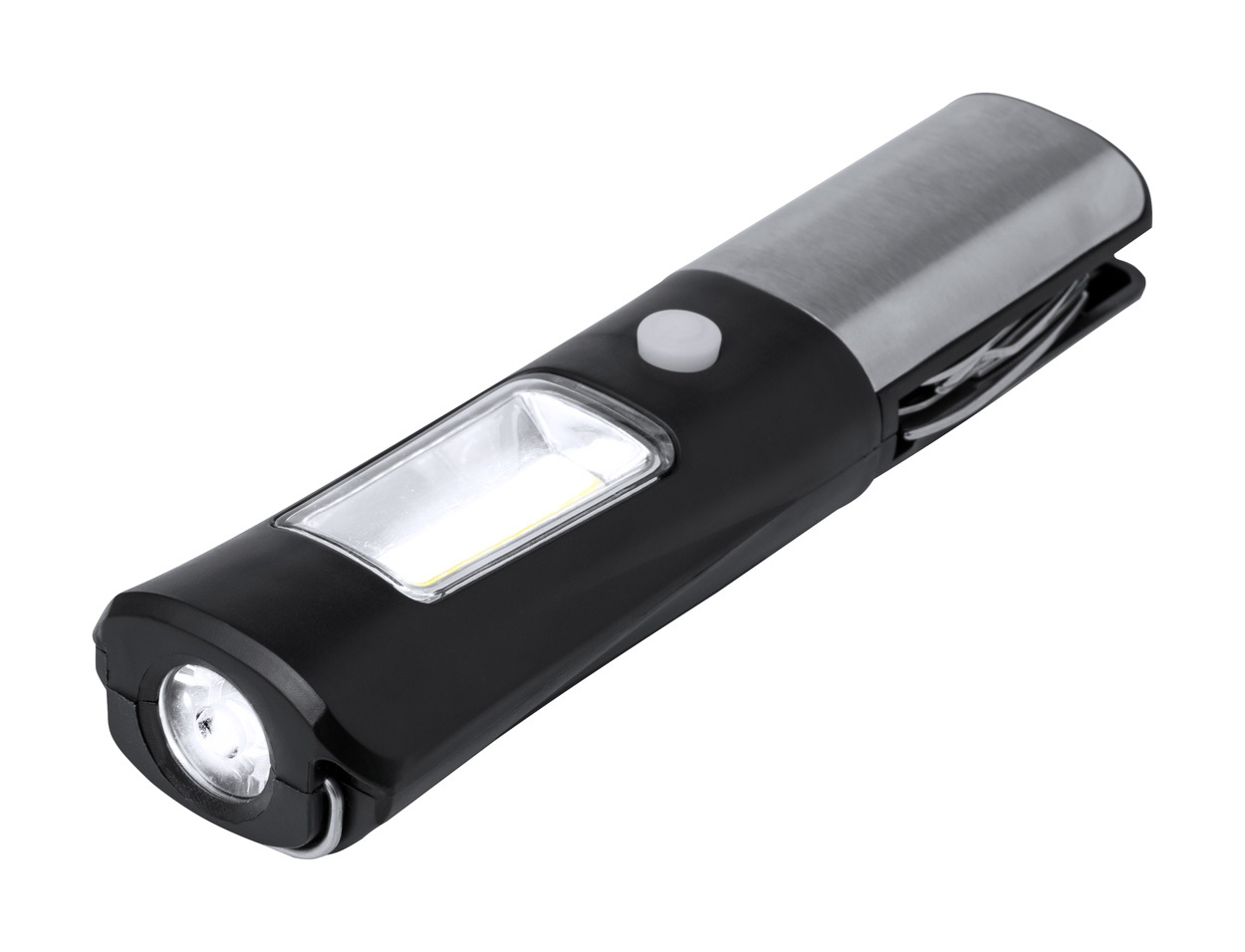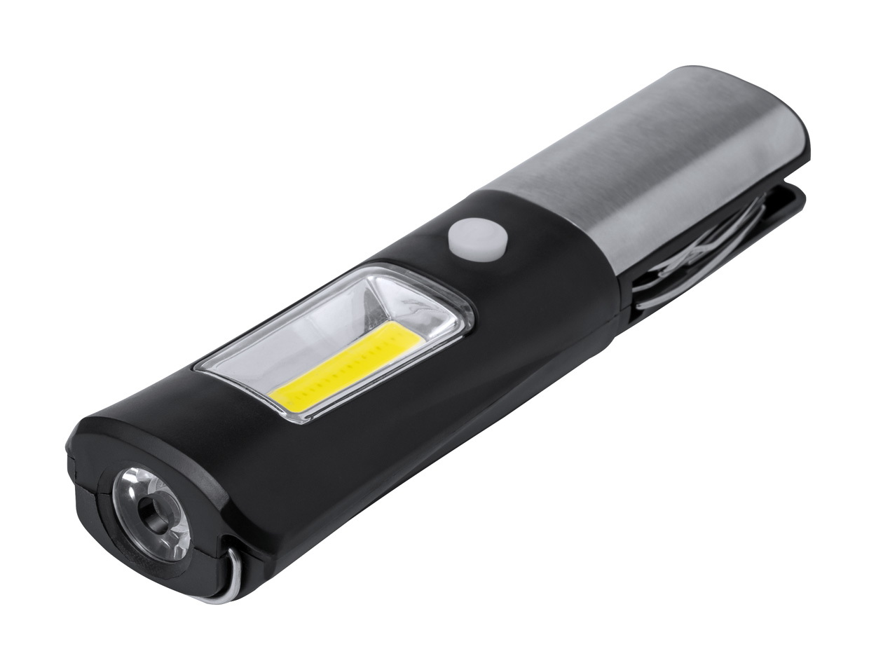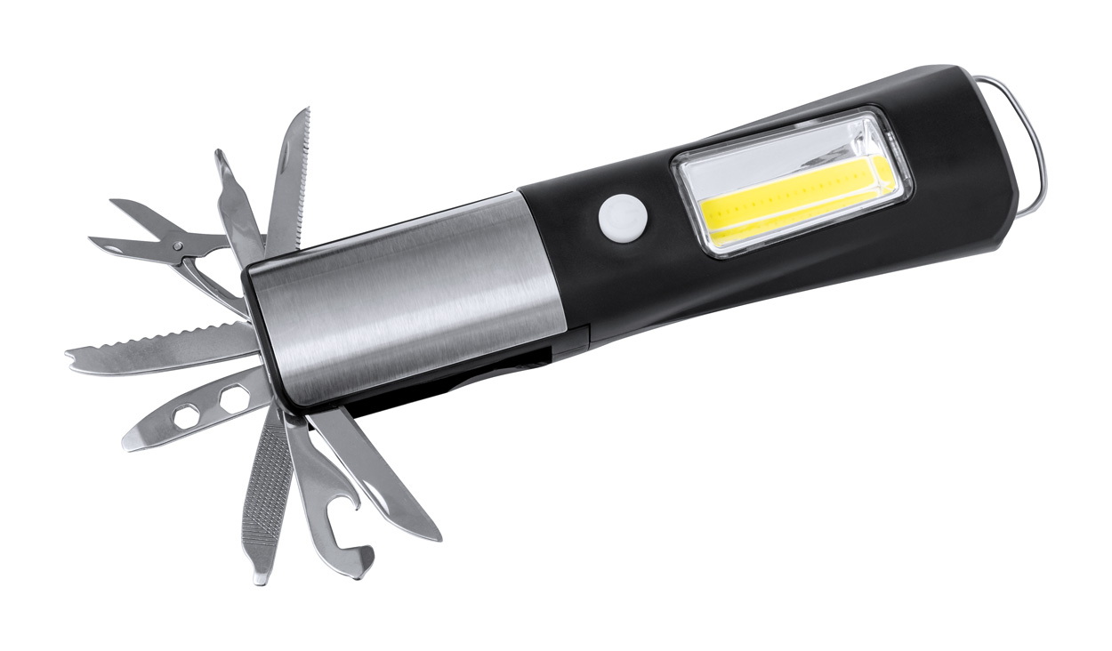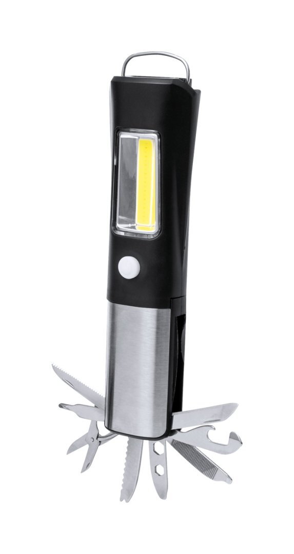 ABS műanyag és rozsdamentes acél multiszerszám 1 LED-es fejlámpával, 19 COB fénnyel, 2 fény móddal és 13 funkcióval. 3 AAA elemmel működik. Elemek nélkül szállítjuk.