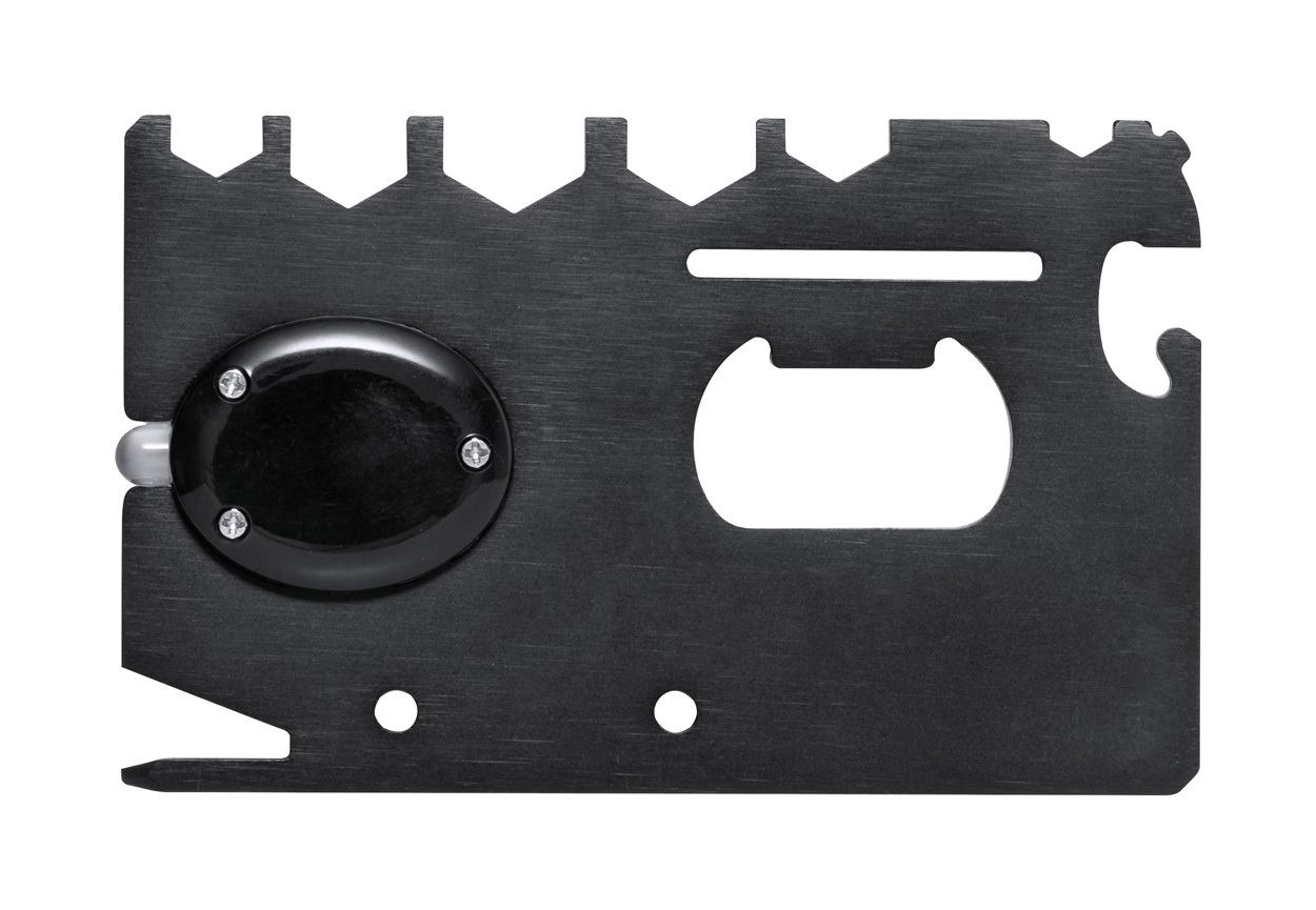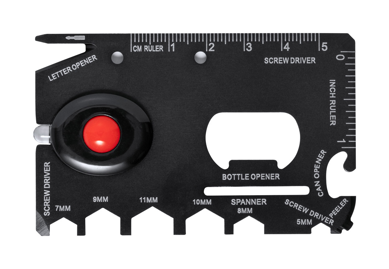 Rozsdamentes acélból készült, kártya alakú multiszerszám 1 LED-del és 16 funkcióval. Gombelemmel szállítjuk.