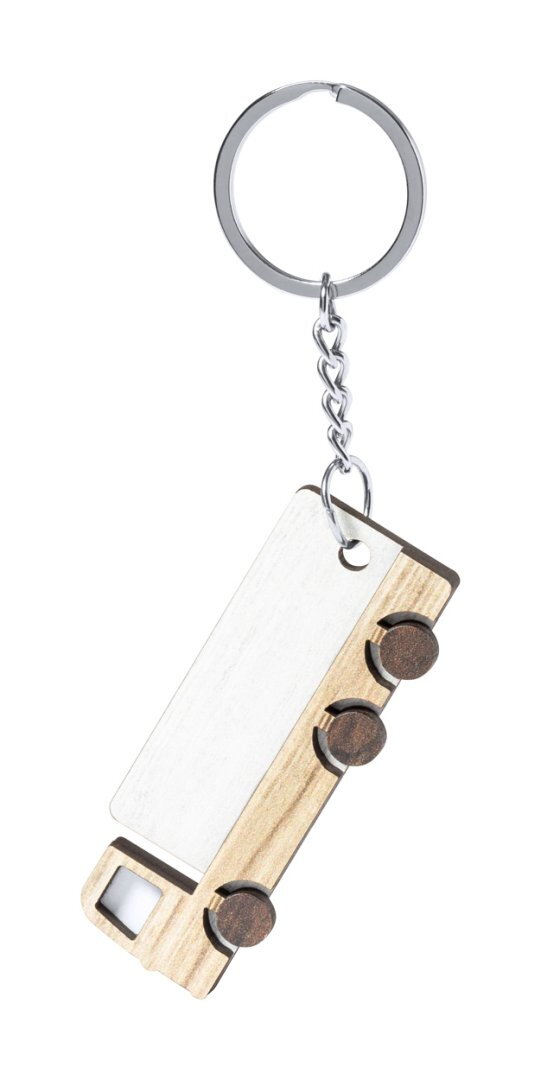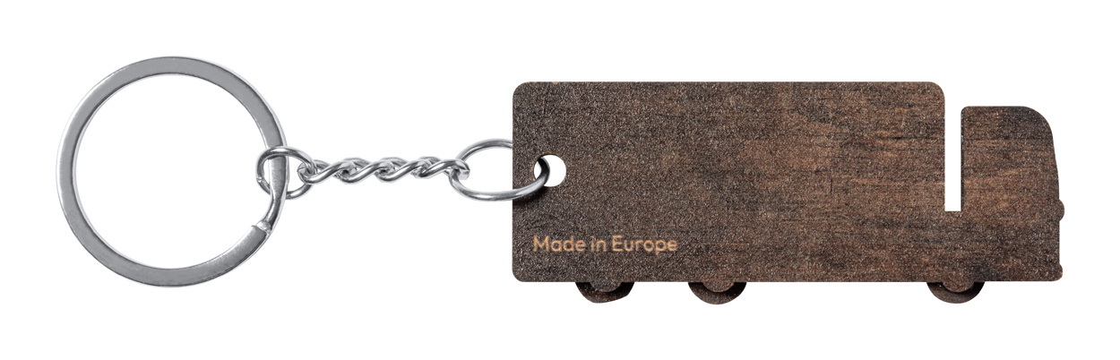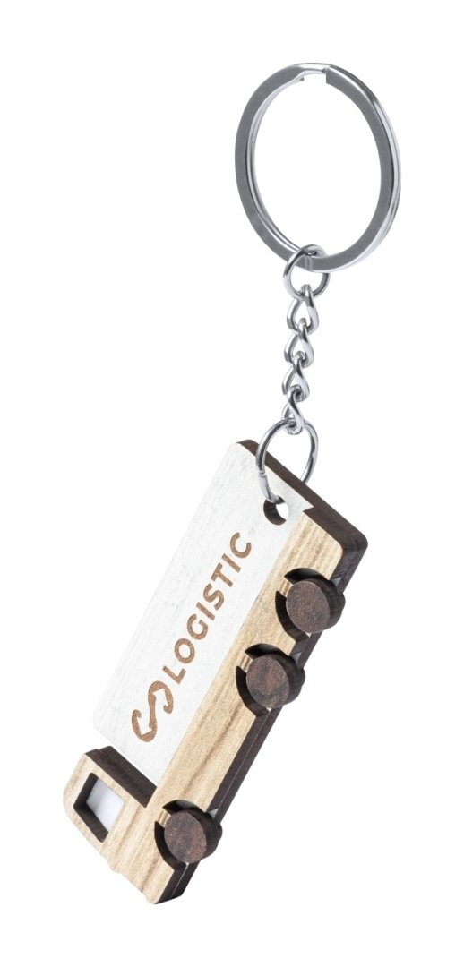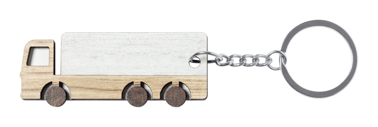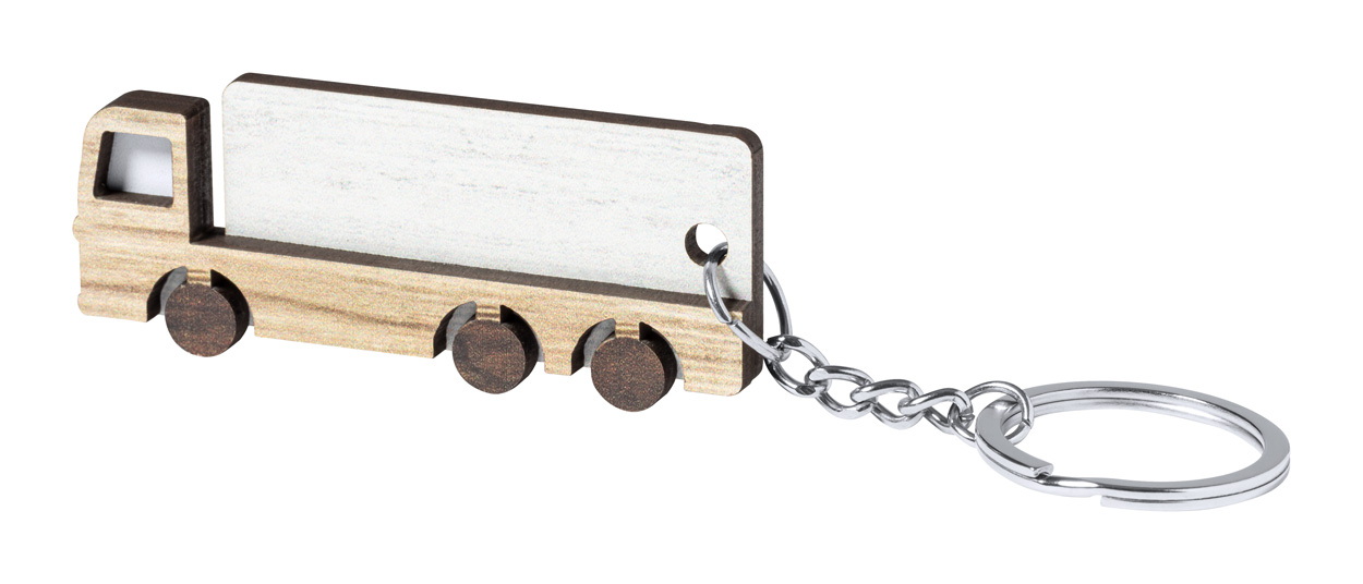 Teherautó-alakú fa kulcstartó fém karikával, kéttónusú kivitelben.