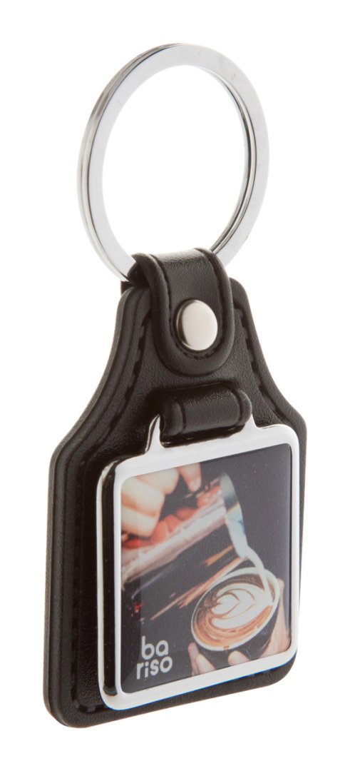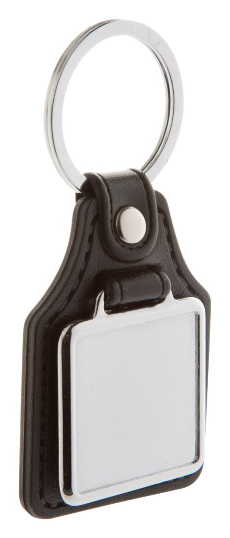 Négyzet alakú, műbőr kulcstartó fém kulcskarikával. A közepén található fém rész epoxy gyantás matricával emblémázható. A termék ára az emblémázás költségét tartalmazza. Minimális rendelési mennyiség: 100 db.