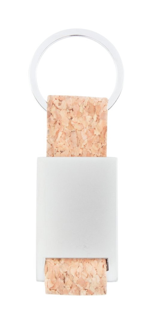 Téglalap alakú, fém kulcstartó természetes parafa pánttal és fém karikával.