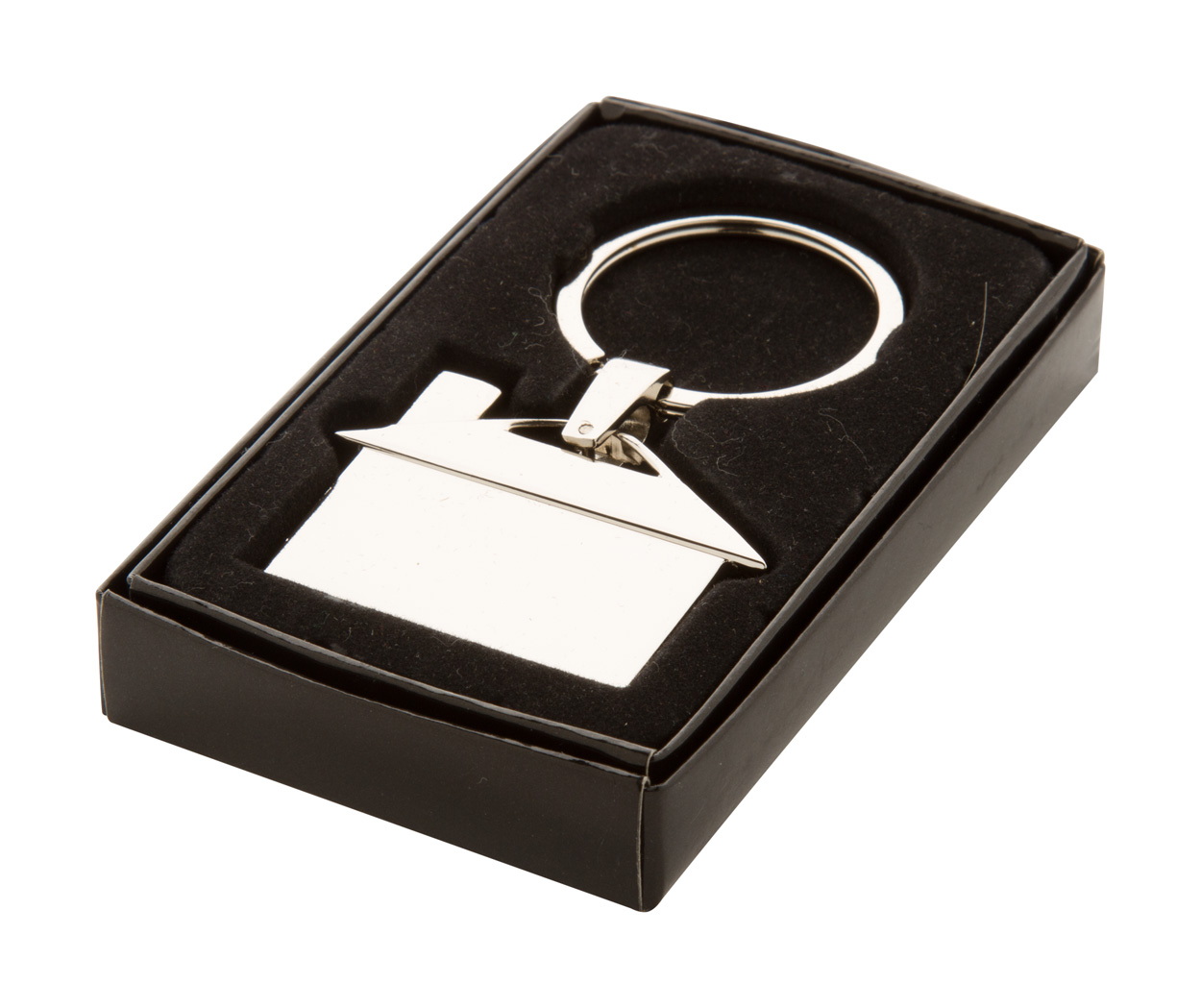 Ház alakú, fém kulcstartó, fekete kartondobozban szállítjuk.