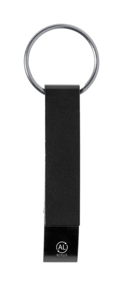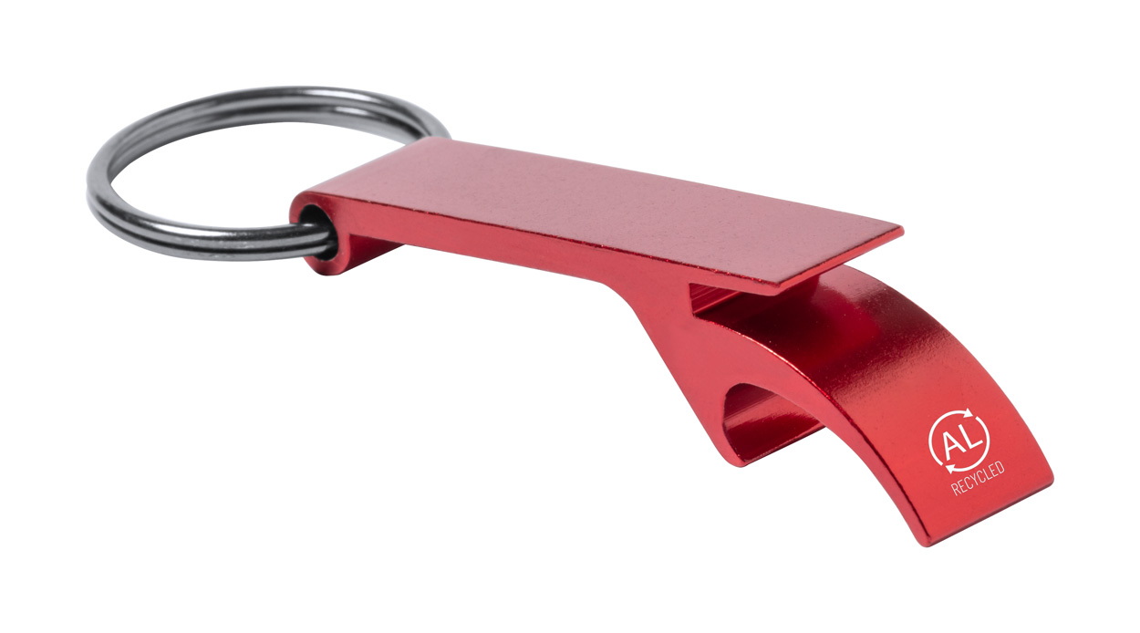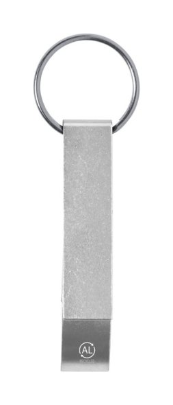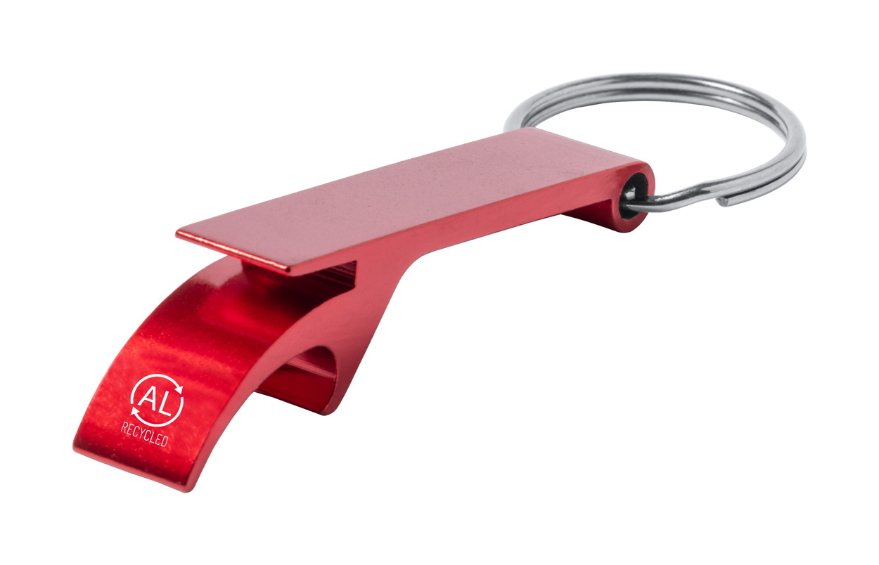 Újrahasznosított alumínium kulcstartó, üveg- és konzervnyitó funkcióval, fém karikával.