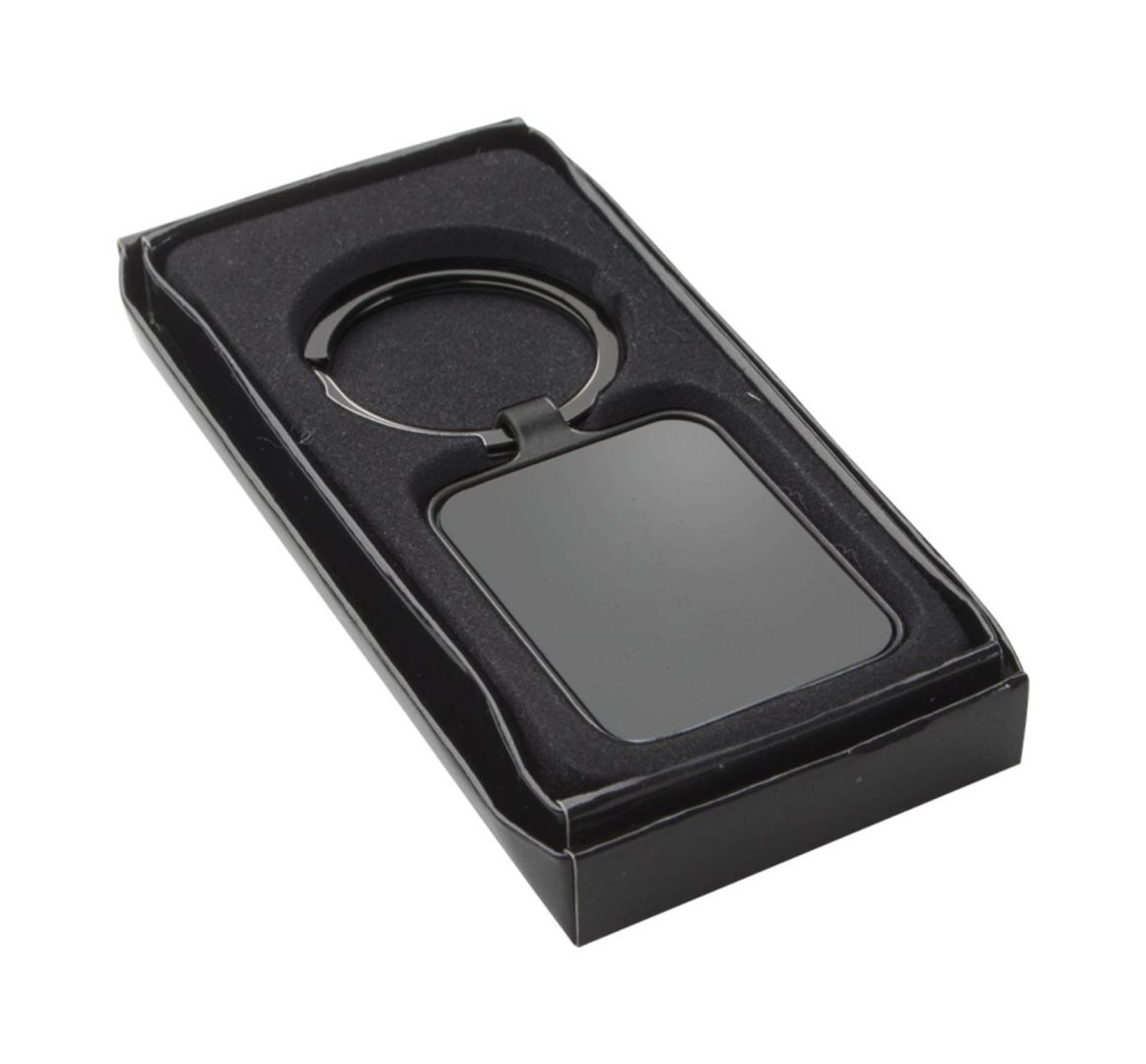Fém, téglalap alakú kulcstartó, mindkét oldalon fényes felületű fém betéttel. Fekete díszdobozban szállítjuk.