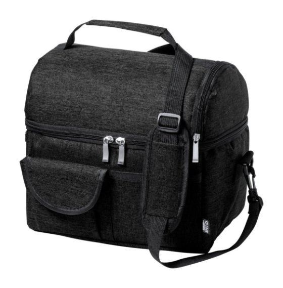 RPET hűtőtáska PEVA párnázással, cipzáras rekeszekkel, elülső zsebbel, fogantyúval és állítható vállpánttal. Megkülönböztető RPET címkével. 600D RPET poliészter.
