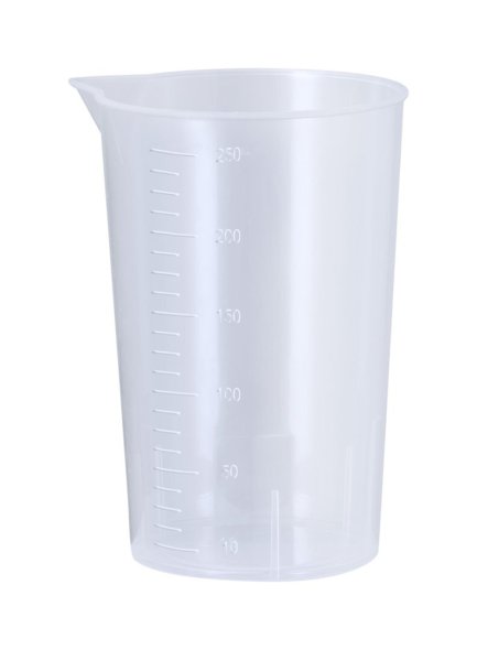Ellenálló, átlátszó PP műanyag mérőpohár, 250 ml.