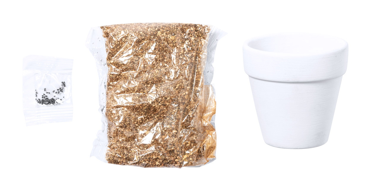 Virágültető készlet terrakotta cserépben, kaktuszmagokkal és termesztő szubsztráttal.