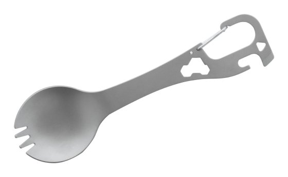 Rozsdamentes acél evőeszköz (kanál és villa) multiszerszám karabinerrel.