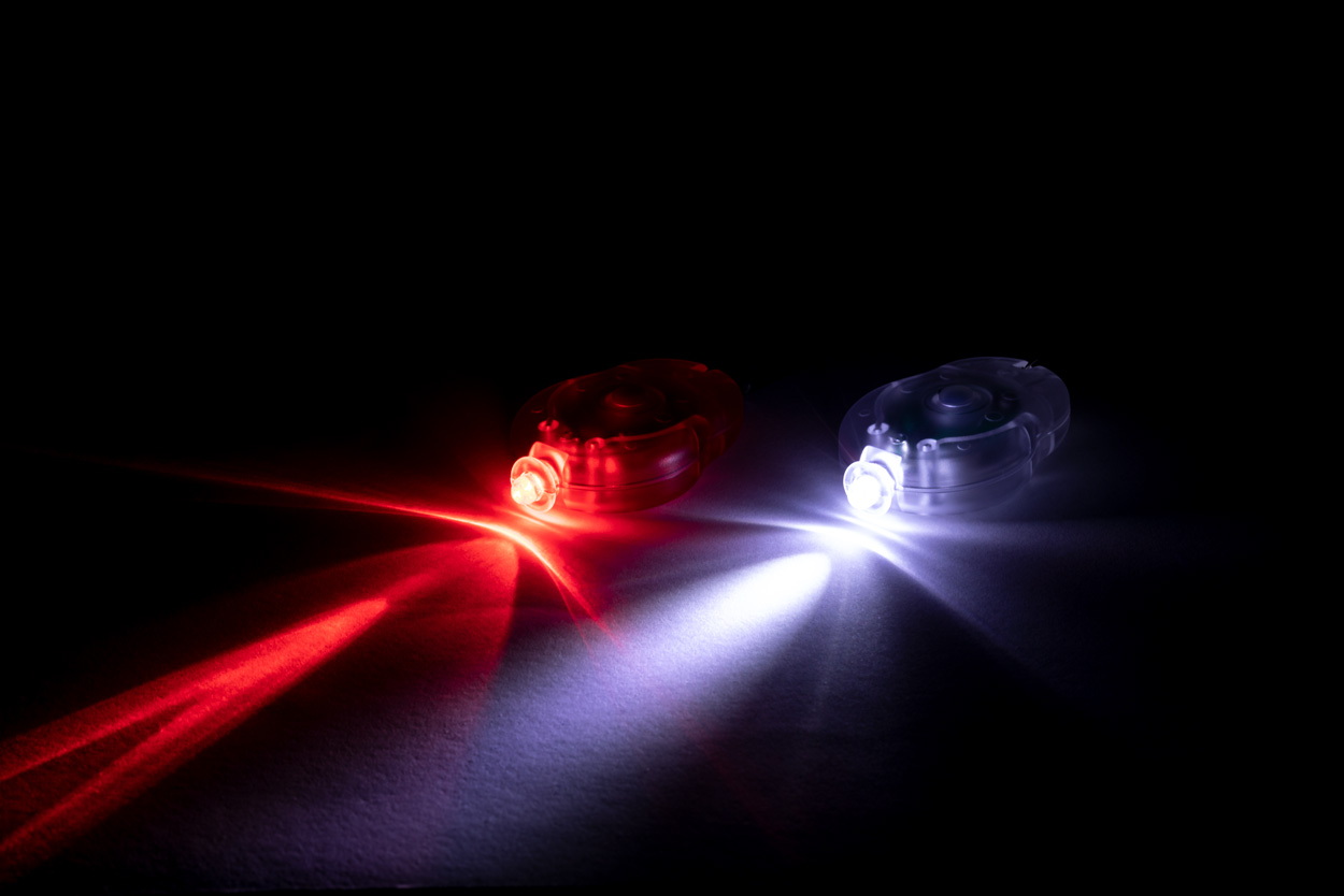2 db piros-fehér biztonsági lámpa készlet kerékpárhoz, PP dobozban. 2 gombelem elemmel.