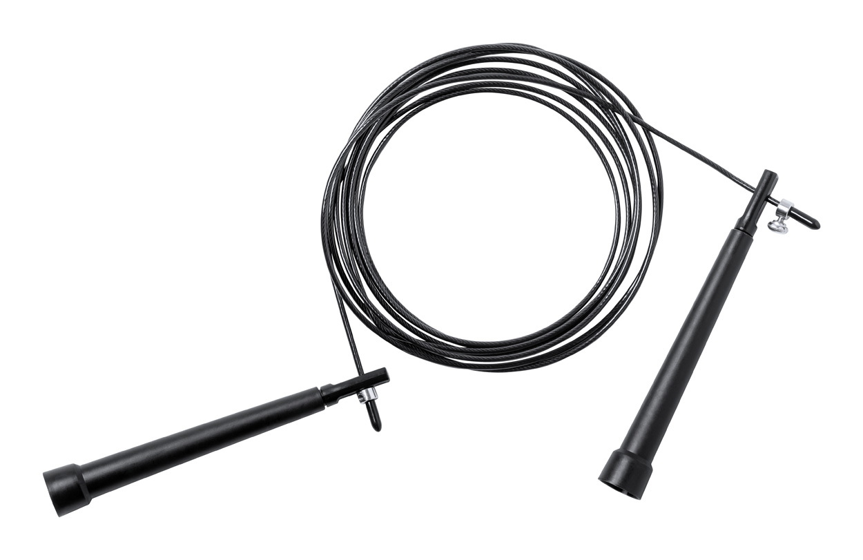 Állítható hosszúságú, 3 m-es ugrókötél PVC bevonatú acélzsinórral. RPET poliészter hordtáskában.