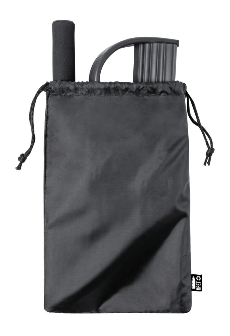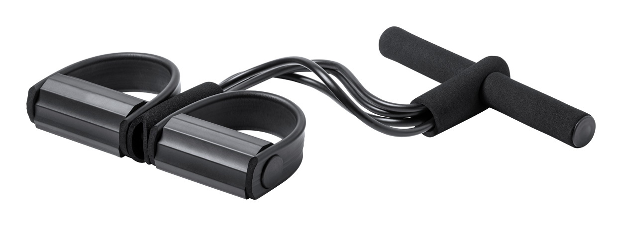 Közepes ellenállású fitness szalag TPE gumiból, EVA és ABS műanyagból készölt párnázott fogantyúkkal és lábtartókkal. RPET poliészter tokban.