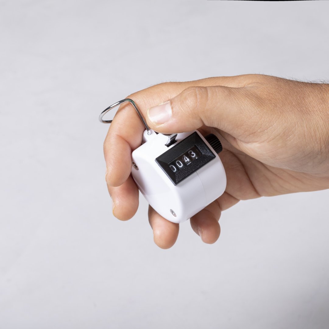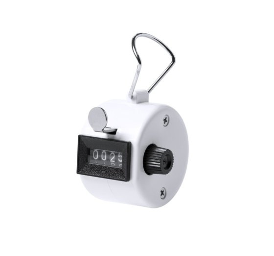 Analóg számláló műanyag házban, négyjegyű számlálóval, oldalsó visszaállító gombbal, fém ujjtartóval és nyomógombbal.