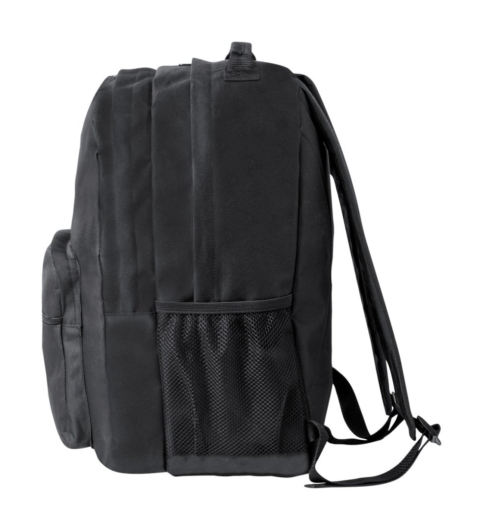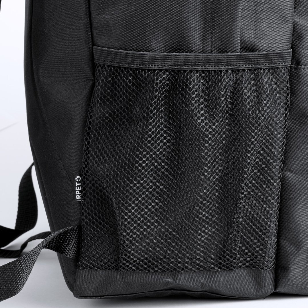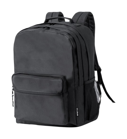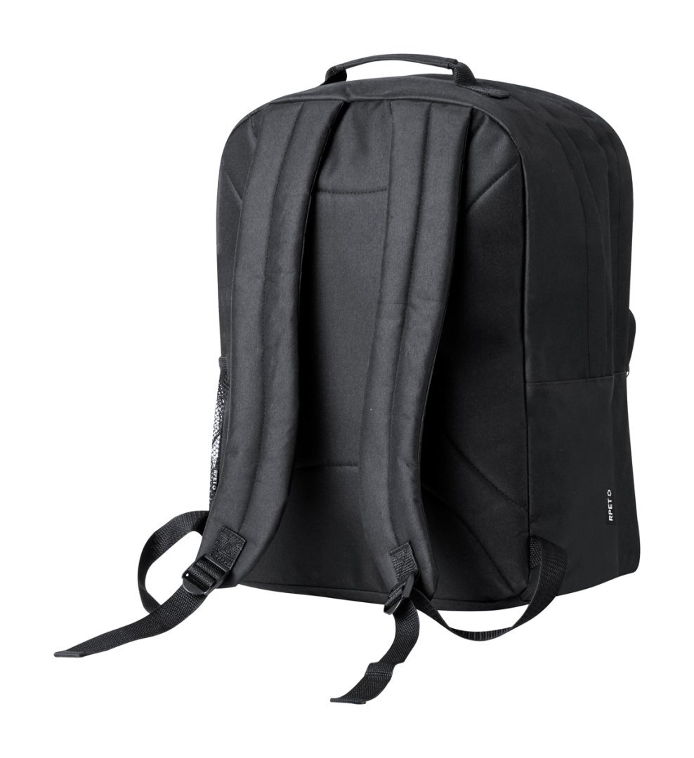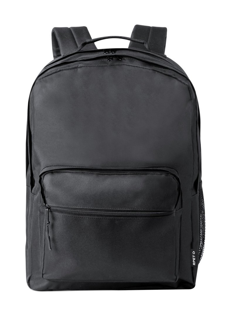 RPET hátizsák cipzáras rekeszekkel, párnázott laptop rekesszel (15"), oldalsó hálós zsebekkel, párnázott hát- és vállpántokkal. 600D RPET poliészter, megkülönböztető RPET címkével.