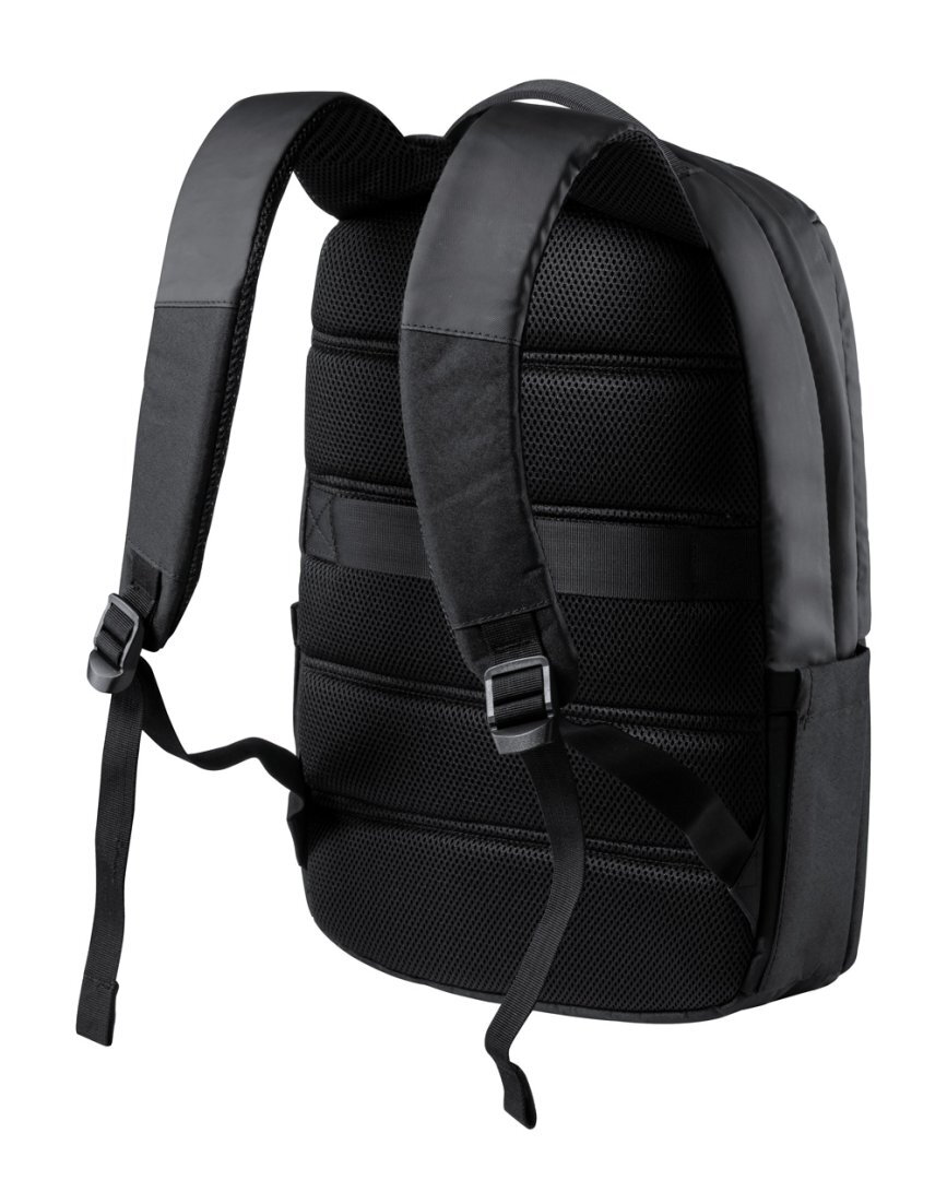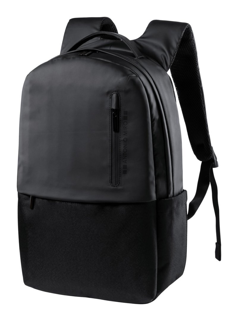 Prémium minőségű hátizsák cipzáros résszel, párnázott laptop (15") és tablet (10") rekeszekkel, elülső zsebbel. Pánttal bőröndre rögzítéshez, párnázott hát- és vállpánttal. 600D poliészter. Antonio Miro márkatermék.