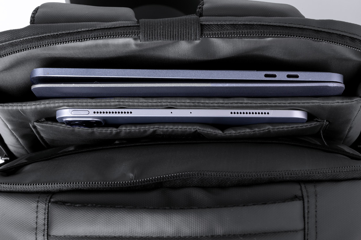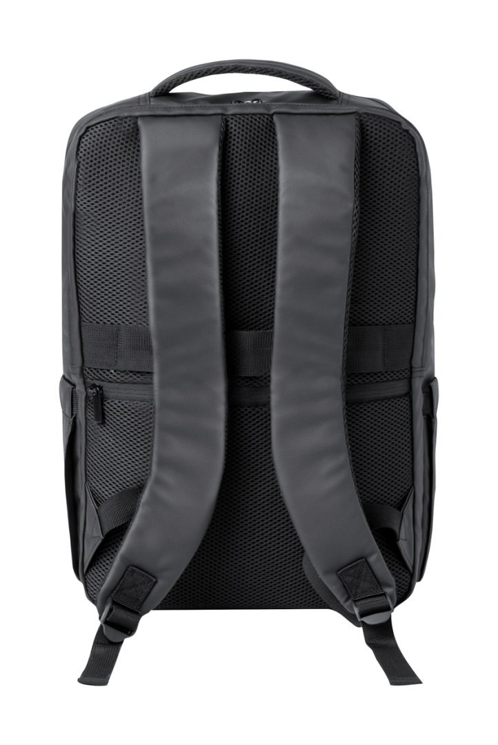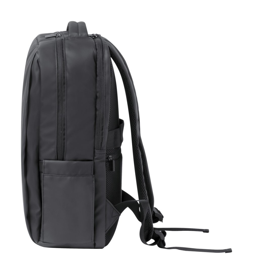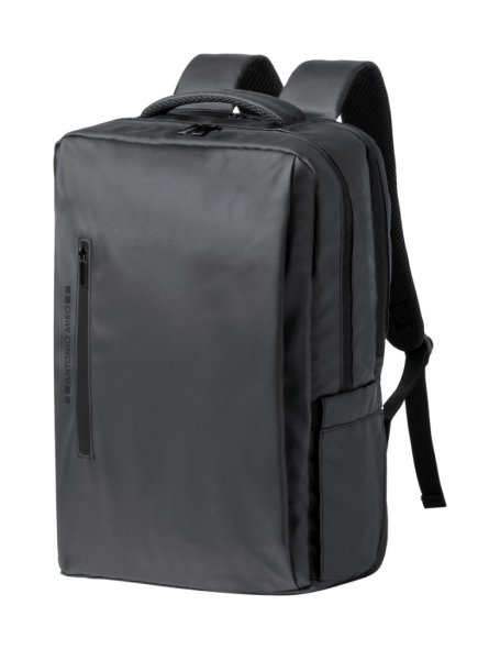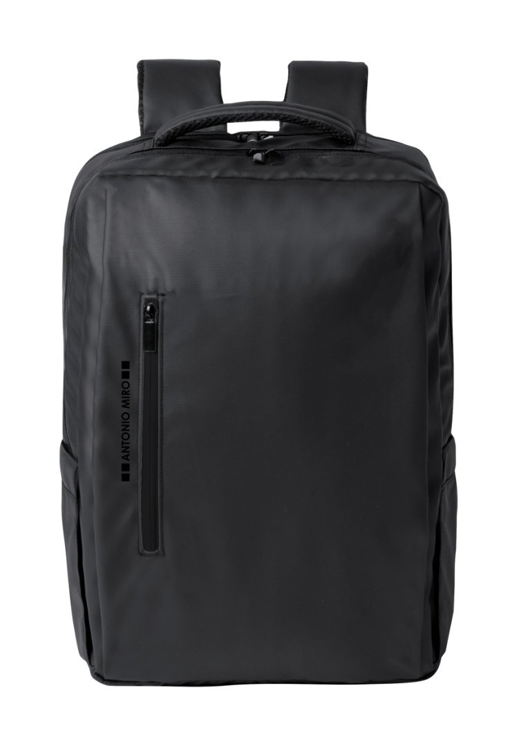 Műbőr hátizsák cipzáras fő rekesszel, párnázott laptop (15") és tablet (10") rekesszel, oldalzsebekkel, párnázott hát- és vállpántokkal. Antonio Miro márkatermék.