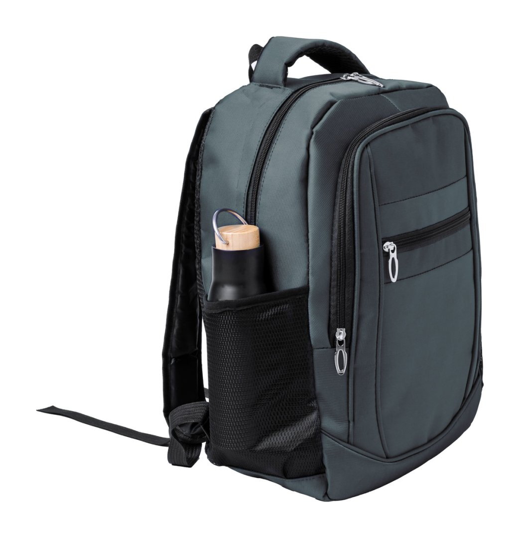 Nylon hátizsák cipzáras rekeszekkel, oldalzsebekkel, párnázott laptop (15") és tablet (10") rekesszel, párnázott hát- és vállpántokkal. 600D nylon.