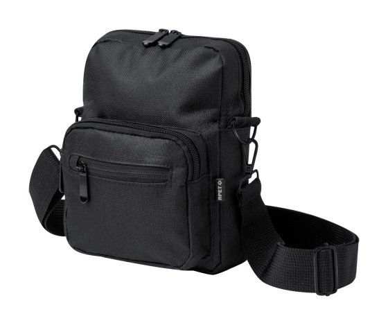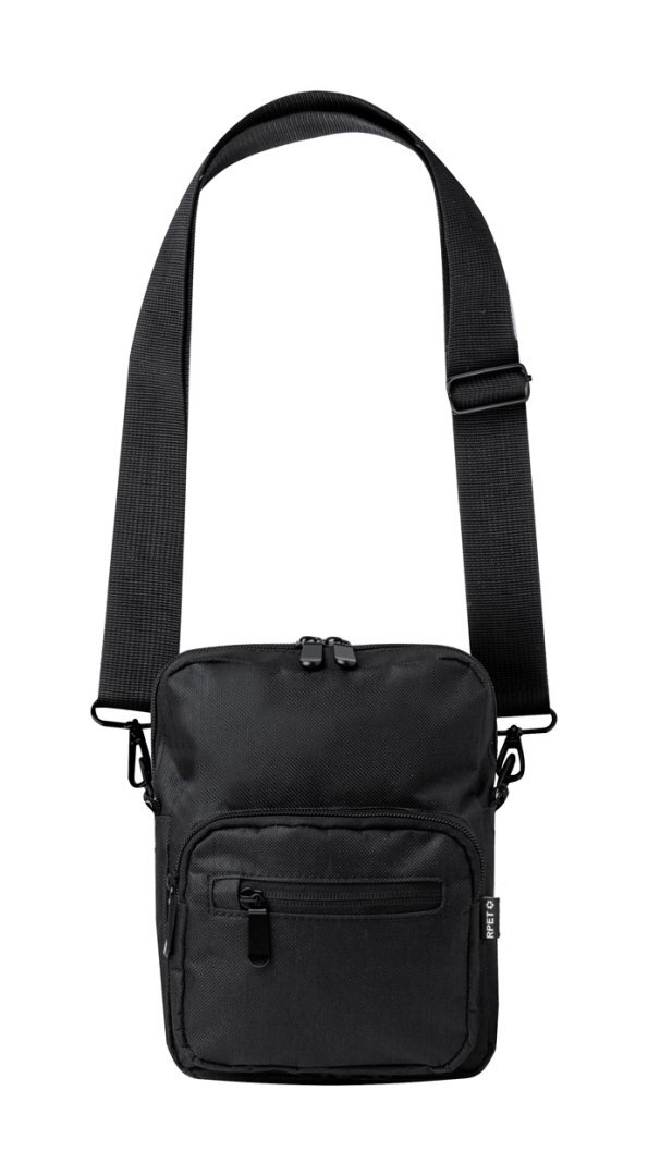 RPET válltáska cipzáras rekeszekkel és állítható vállpánttal. 600D RPET poliészter, megkülönböztető RPET címkével.