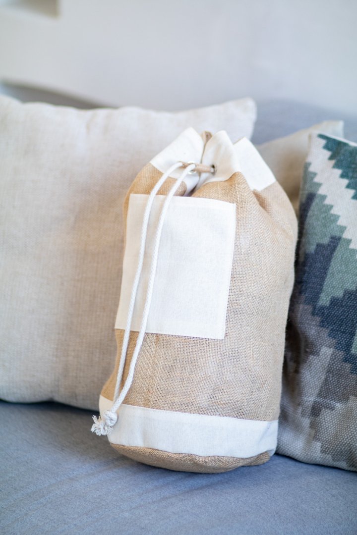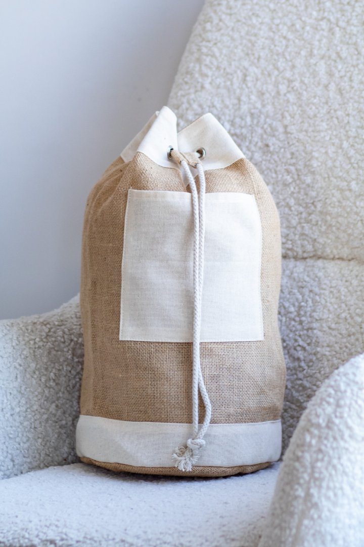 Juta tengerészzsák pamut előoldali zsebbel és húzózsinorral.