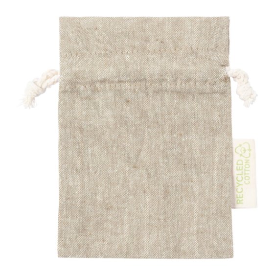 Újrahasznosított pamut ajándéktáska húzózsinórral. Megkülönböztető újrahasznosított pamut címkével. 100% újrahasznosított pamut, 120 g/m².