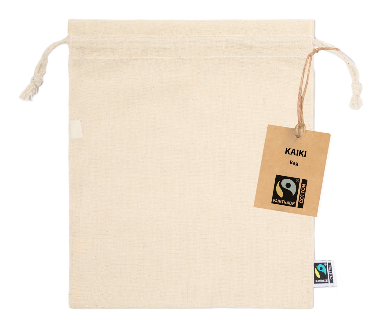 Fairtrade pamut összehúzható hátizsák megkülönböztető Fairtrade címkével. 100% Fairtrade pamut, 105 g/m².