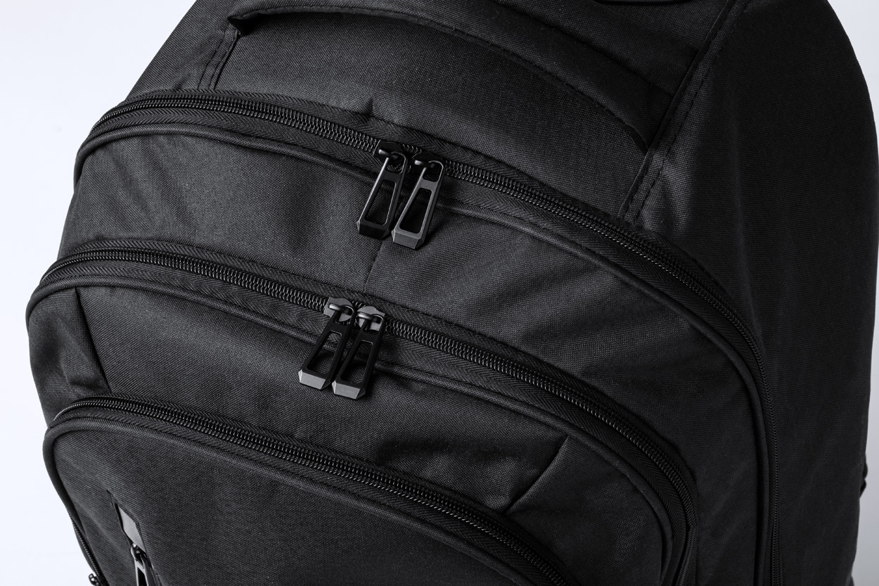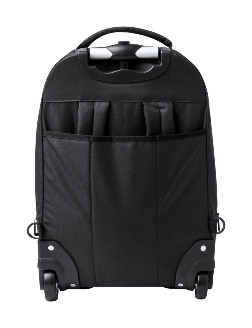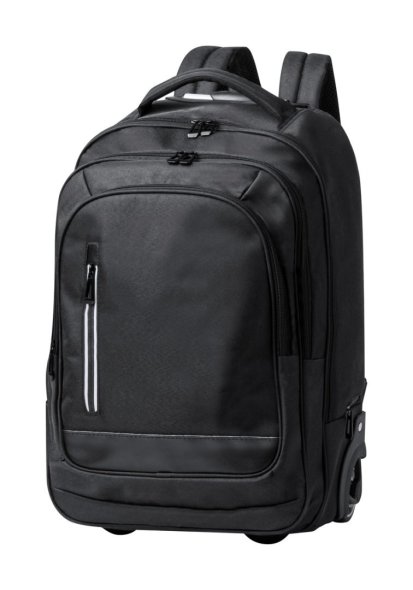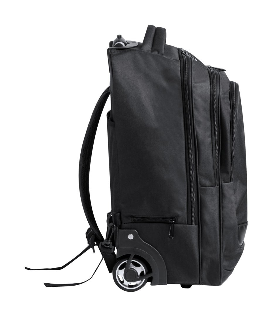 300D poliészter gurulós hátizsák cipzáras rekeszekkel, 2 kerékkel és kihúzható fogantyúval. Laptop rekesszel (15"), párnázott háttámlával és vállpánttal.
