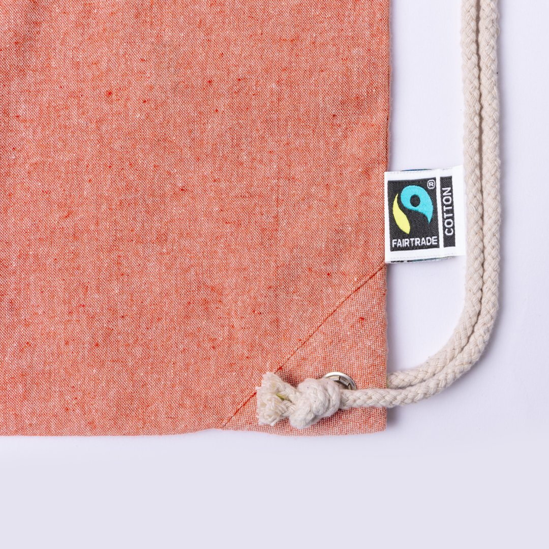 Fairtrade újrahasznosított pamut összehúzható hátizsák és bevásárlótáska hosszú hordfüllel. 100% Fairtrade pamut, 140 g/m². Megkülönböztető Fairtrade címkével.