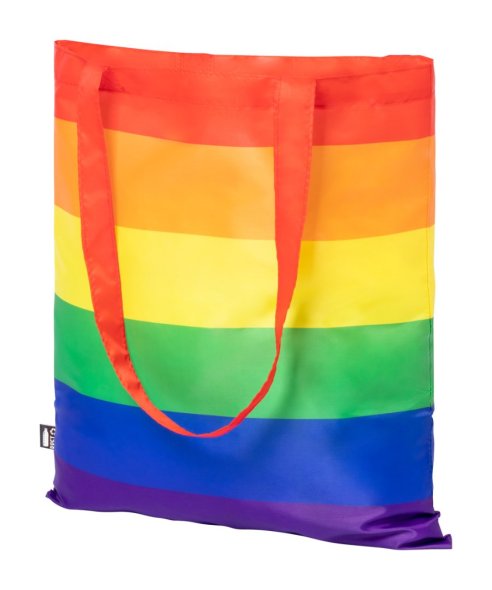 Szivárványszínű RPET poliészter bevásárlótáska hosszú hordfüllel. 210 RPET poliészter. Megkülönböztető RPET címkével.