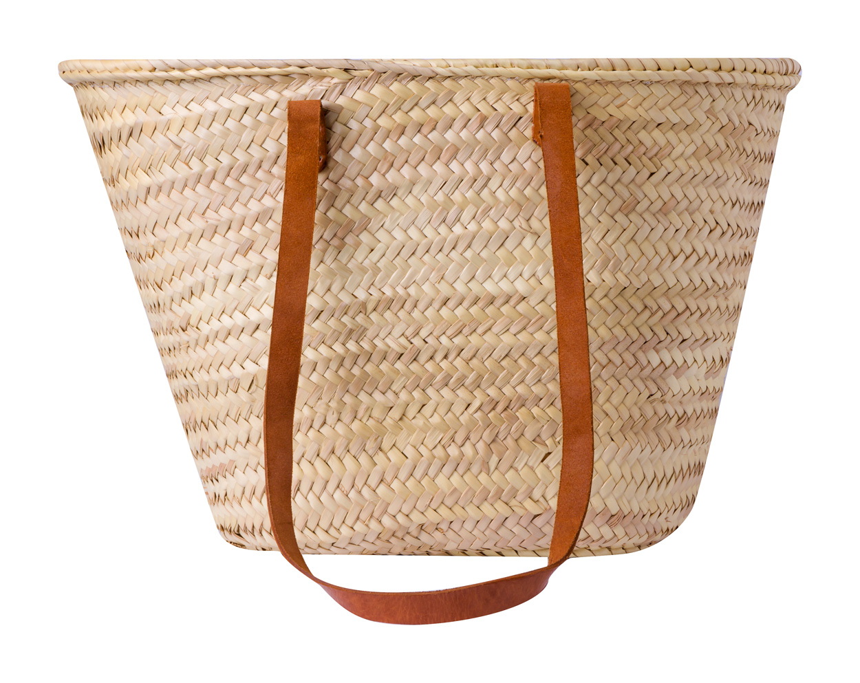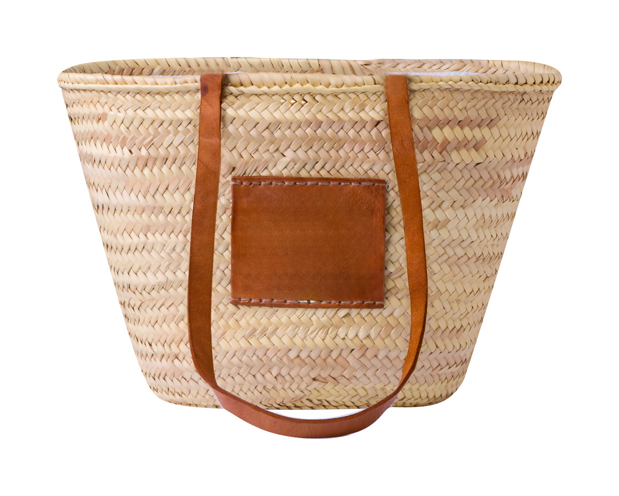 Szalma strandtáska műbőr résszel és fogantyúval.