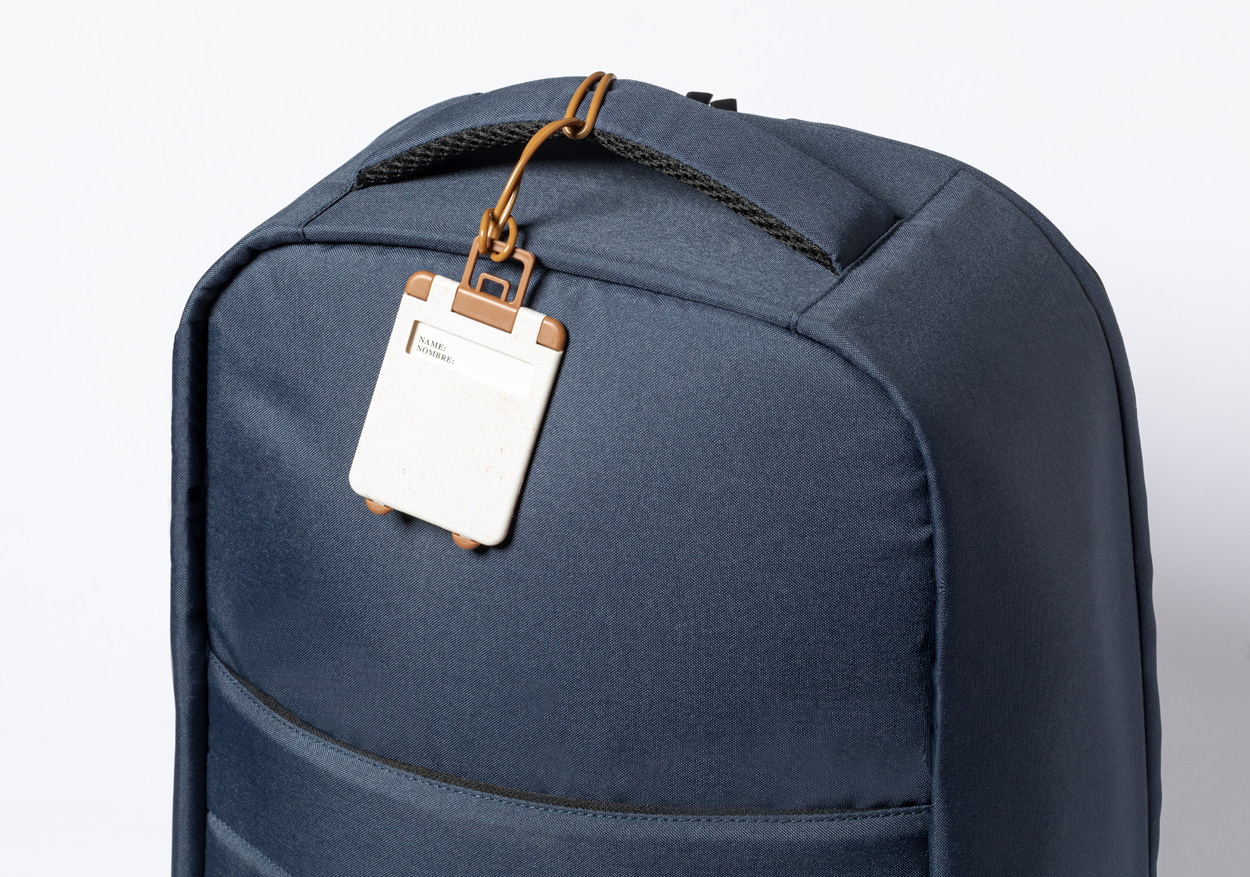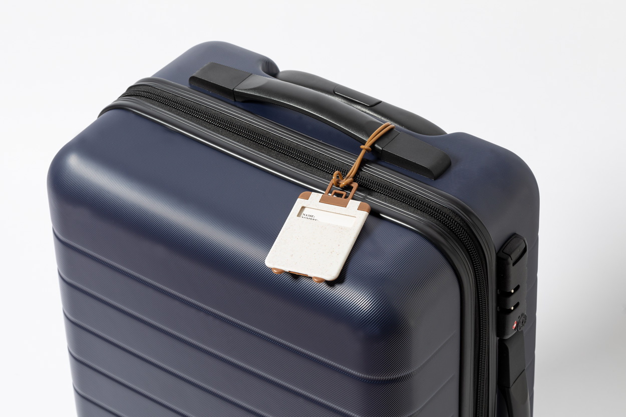 Bőrönd alakú, ökológiai búzaszalma műanyagból készült bőröndcímke papírbetéttel.
