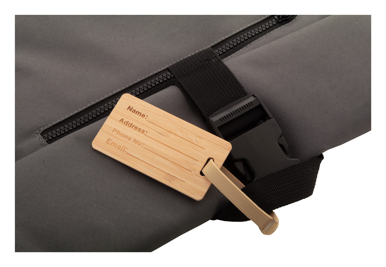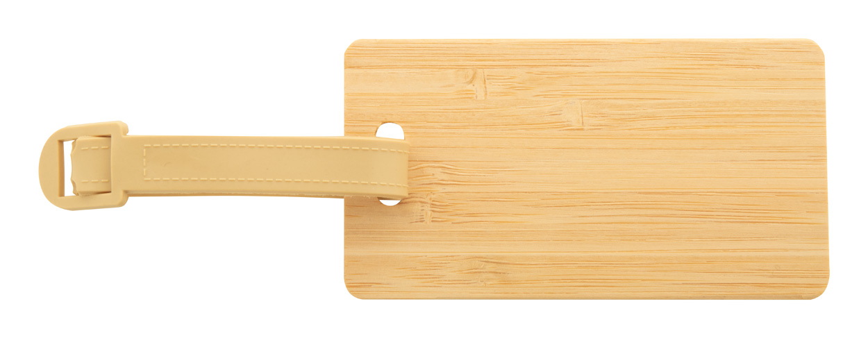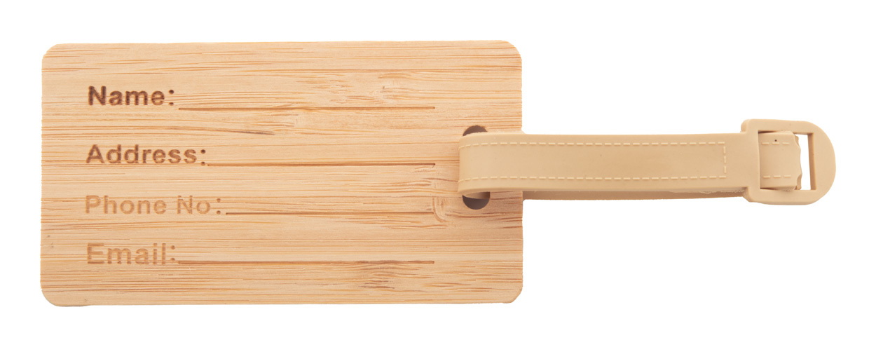 Bambusz bőröndcímke műanyag pánttal és csattal.